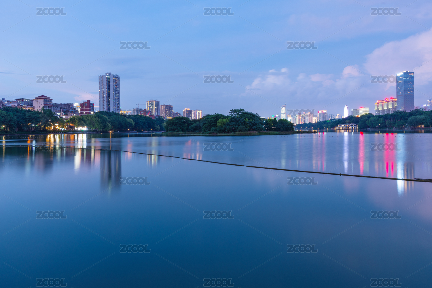 南宁南湖公园夕阳黄昏与城市摩天大楼建筑