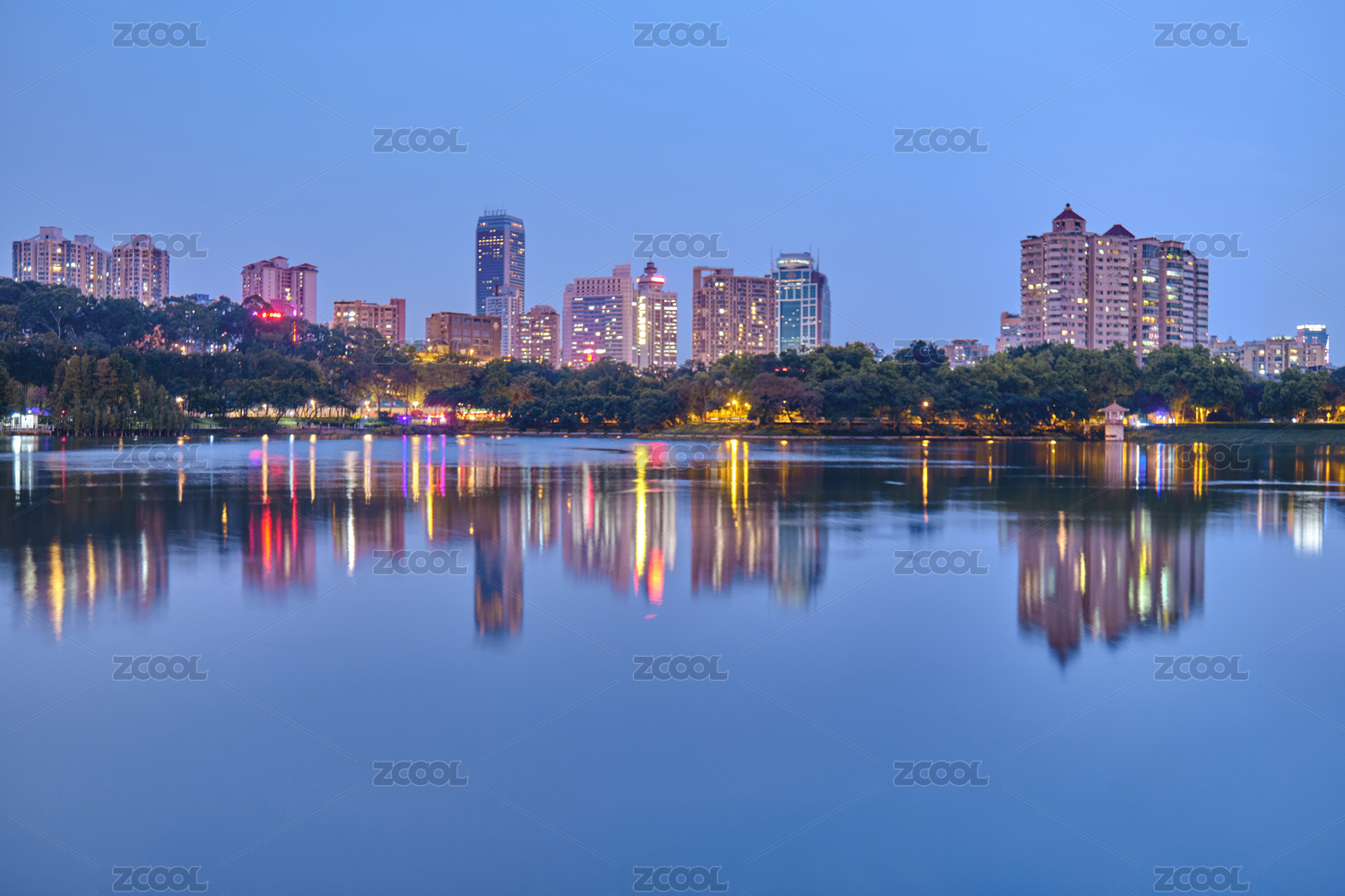 广西南宁南湖公园与城市摩天大楼建筑夜景