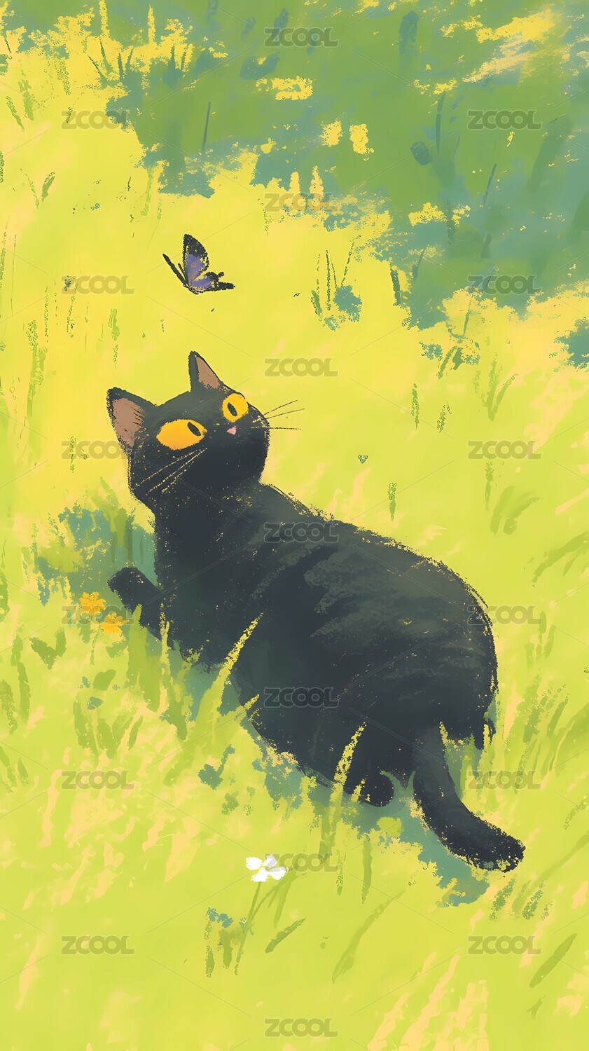 可爱蜡笔彩铅手绘肌理感小白猫手机插画壁纸
