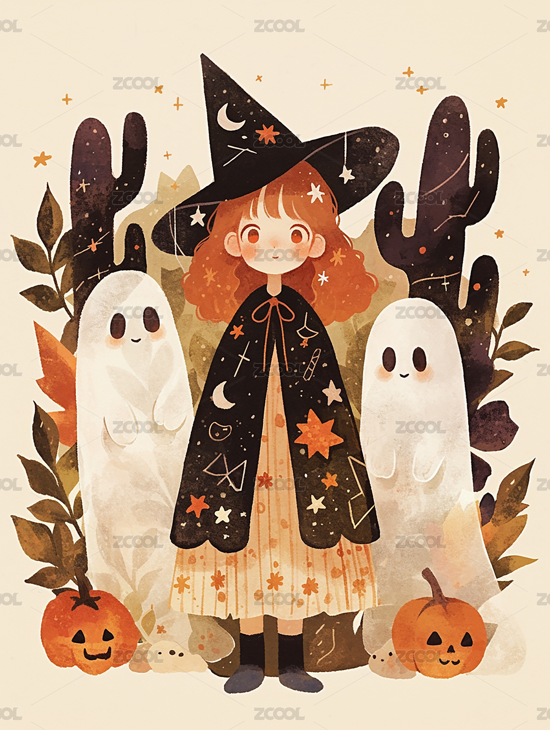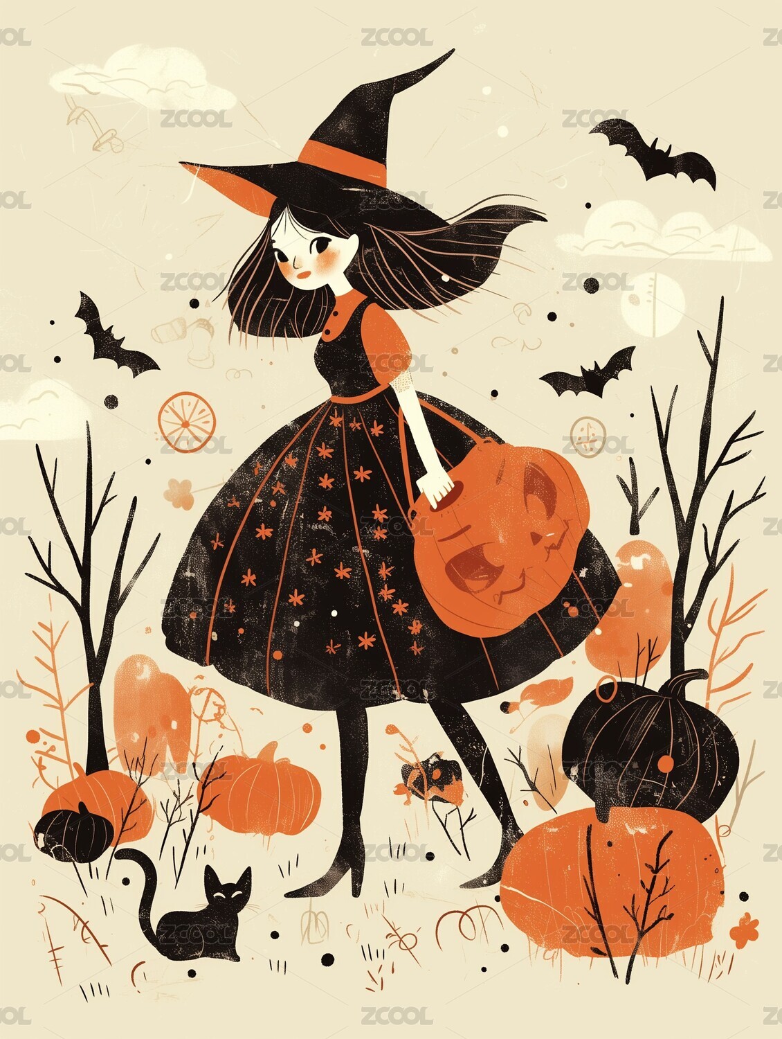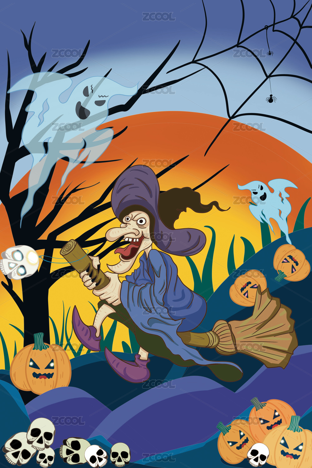 HEYYTGF2020,扫把,插画,鬼,树木,植物,场景,女孩,儿插,魔女