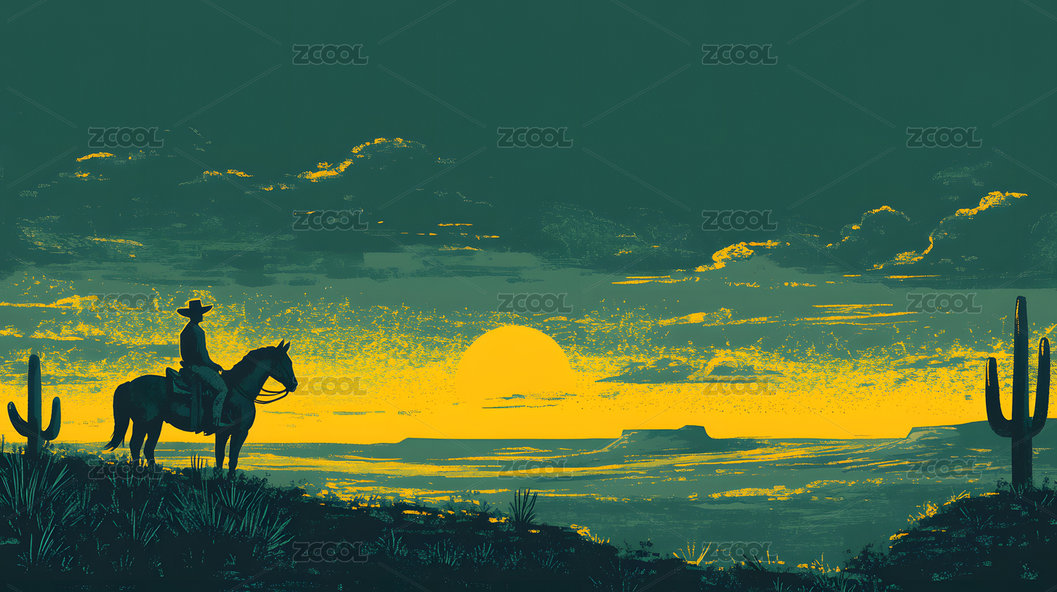 美国西部荒野中骑马吃撑的牛仔徽章装饰画
