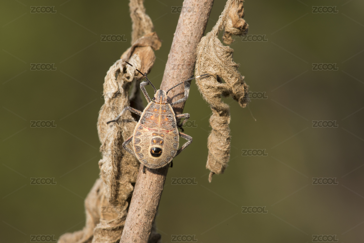 夕阳照耀下趴匐在枯树枝上的麻皮蝽