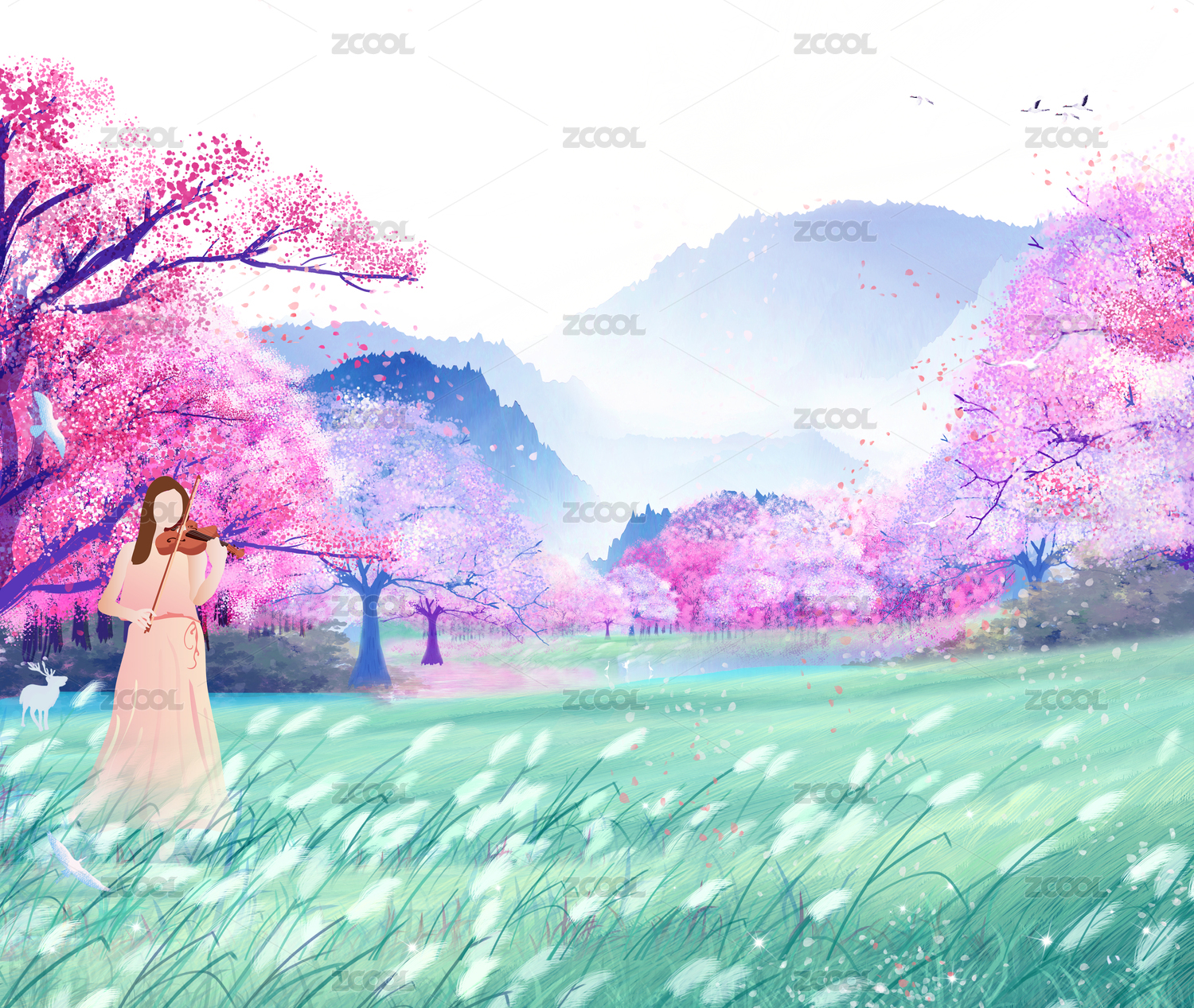 春天,女孩,校园,风景,踏青,插画,背景,花,花树,鲜花