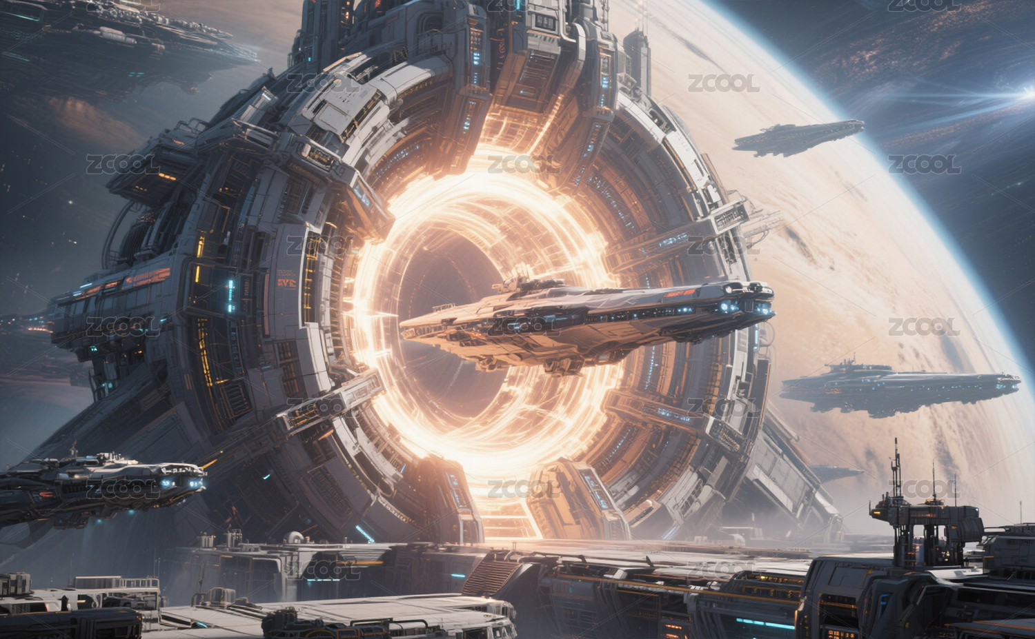 未来高科技宇宙飞船穿越星际之门的科幻插画