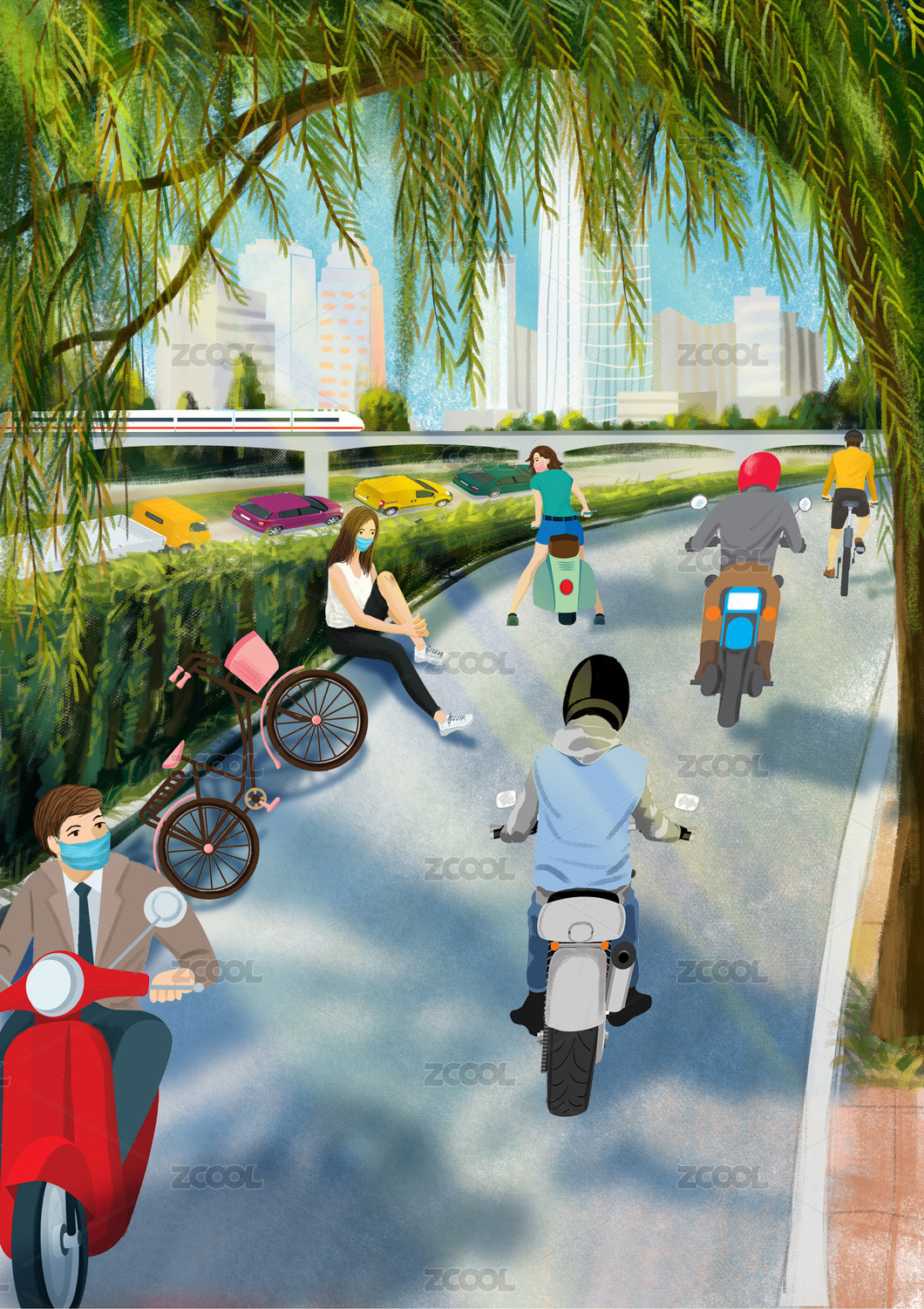 城市公园蓝天白云樱花踏青出游骑车运动矢量