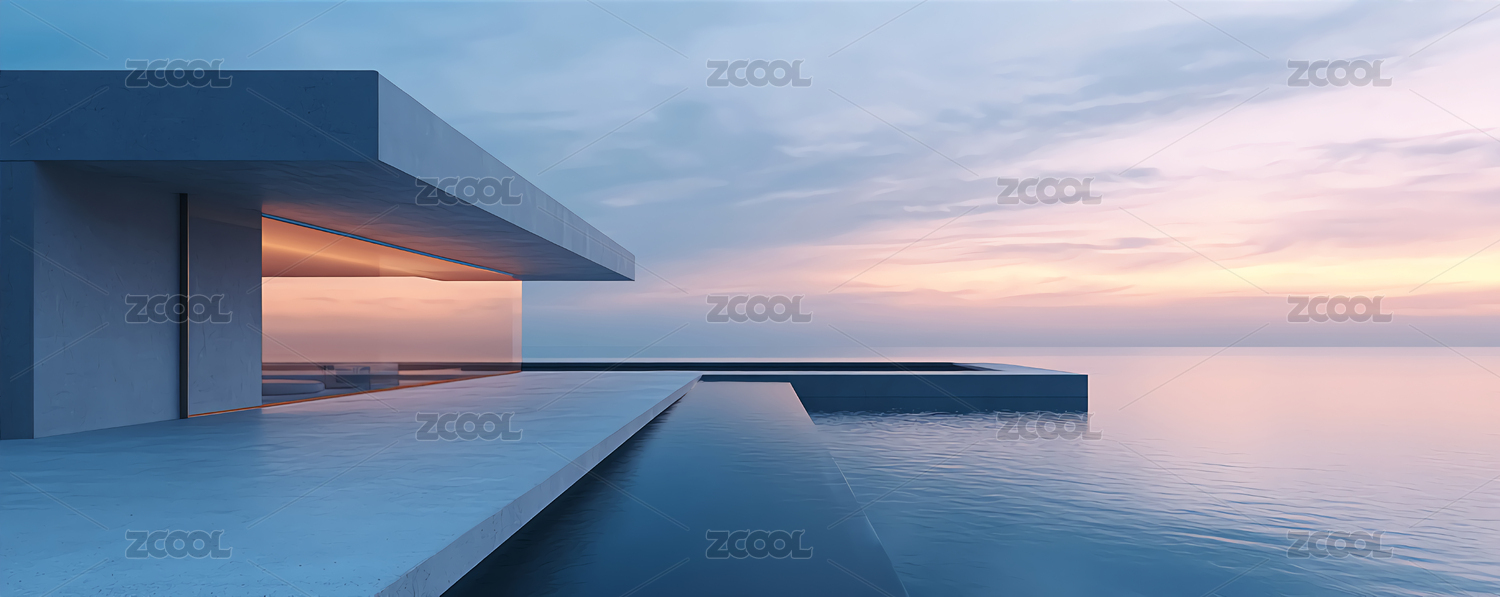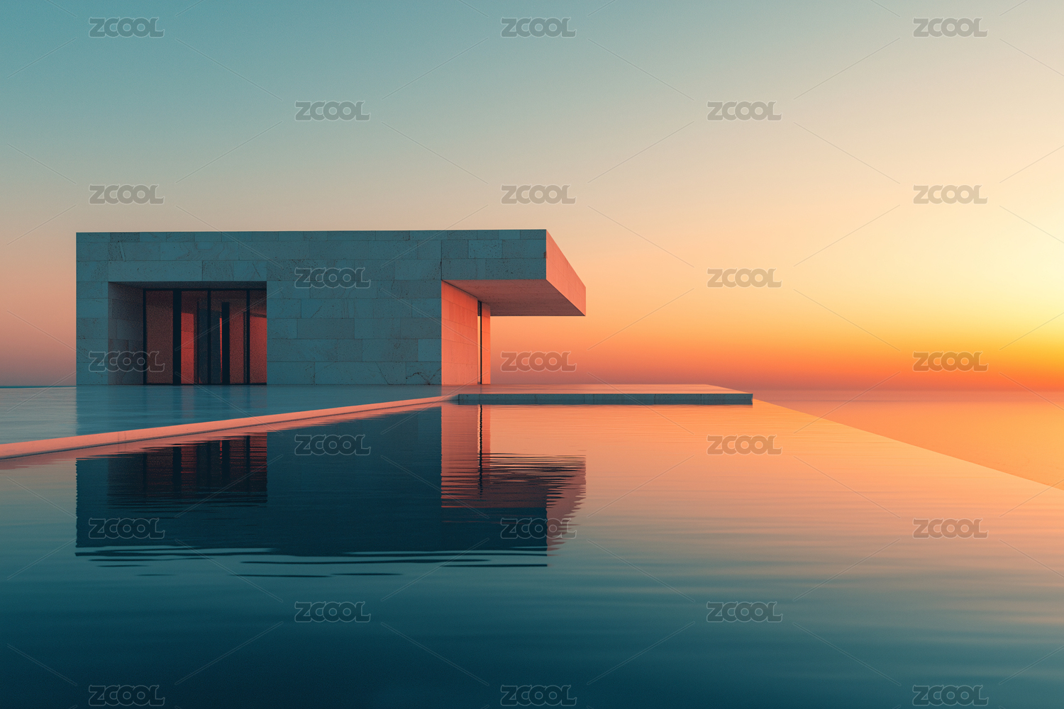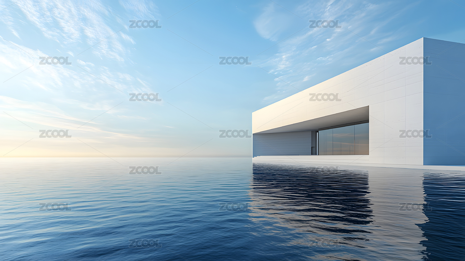 现代,虚拟,建筑,宁静,水面,蓝天,白云,别墅,简约,房屋