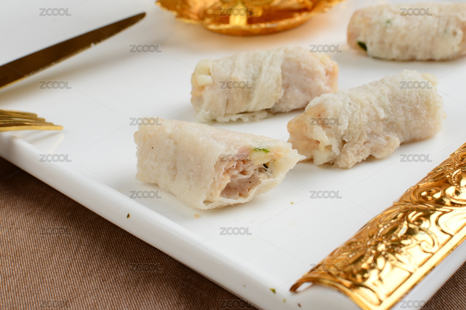 放在白盘上的鱼皮卷火锅料理