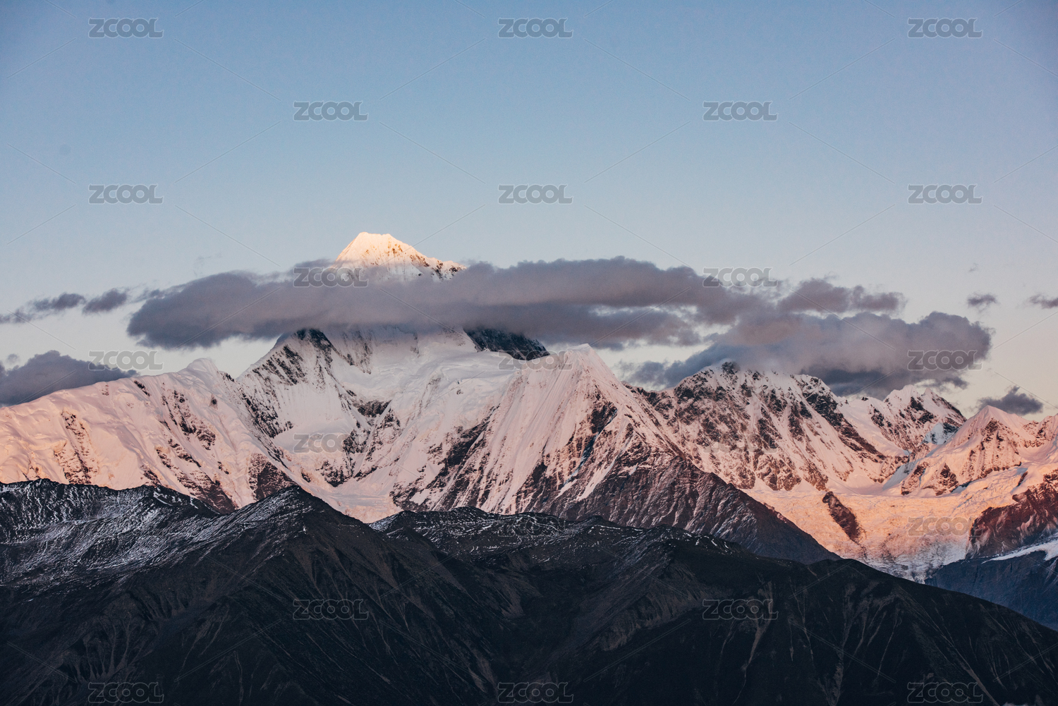 黎明霞光照亮群山雪山