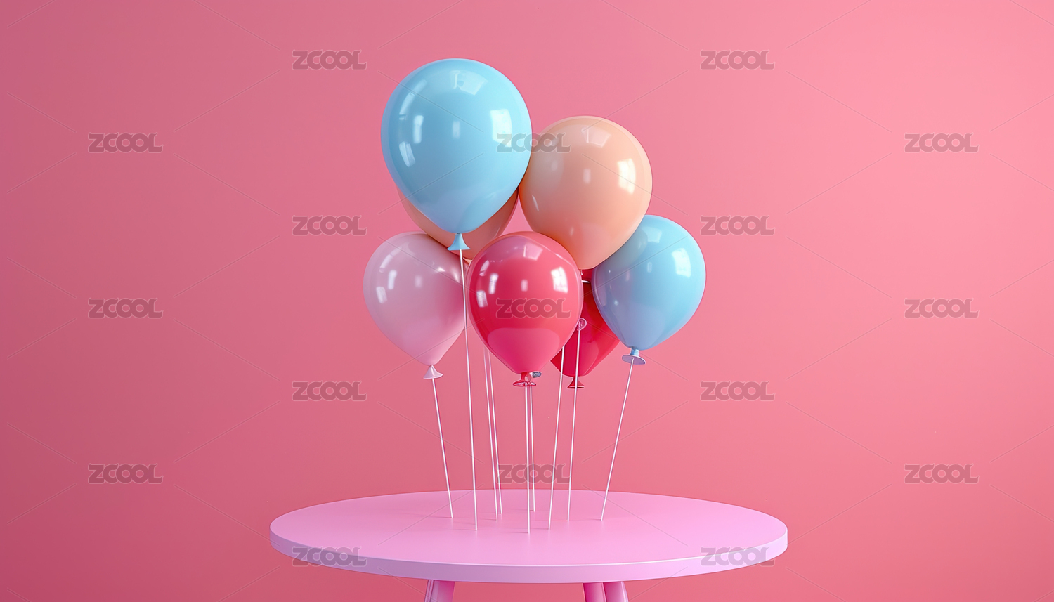 五彩缤纷的生日气球聚会庆祝活动中场景,粉色背景,生日派对3D渲染