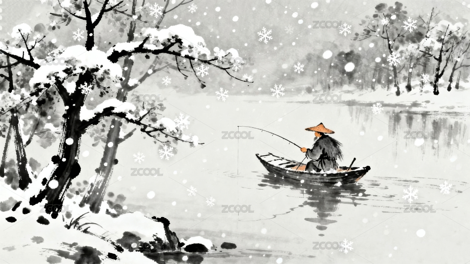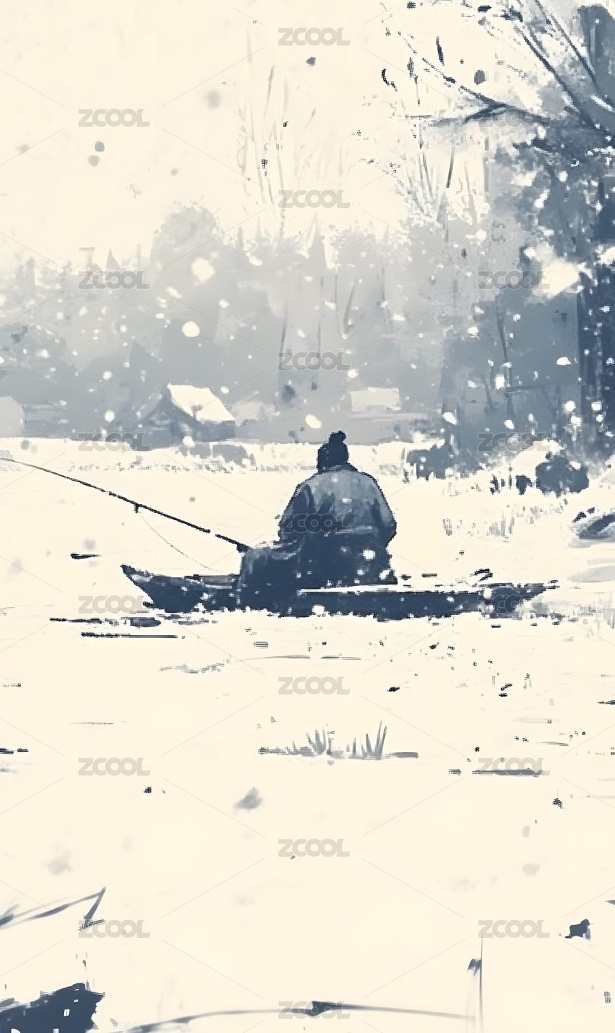 雾中湖面孤舟渔人的诗意冬日水上景观