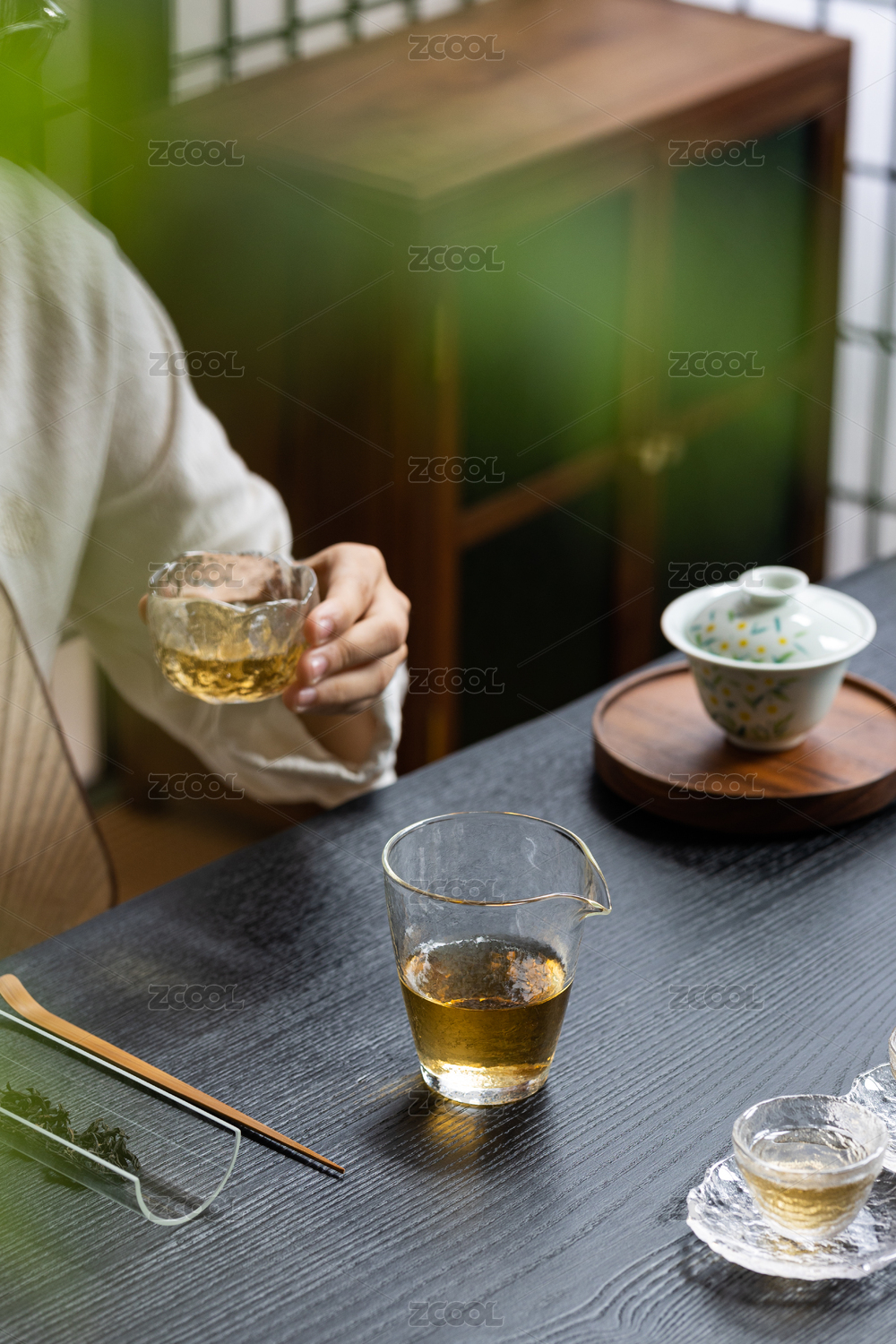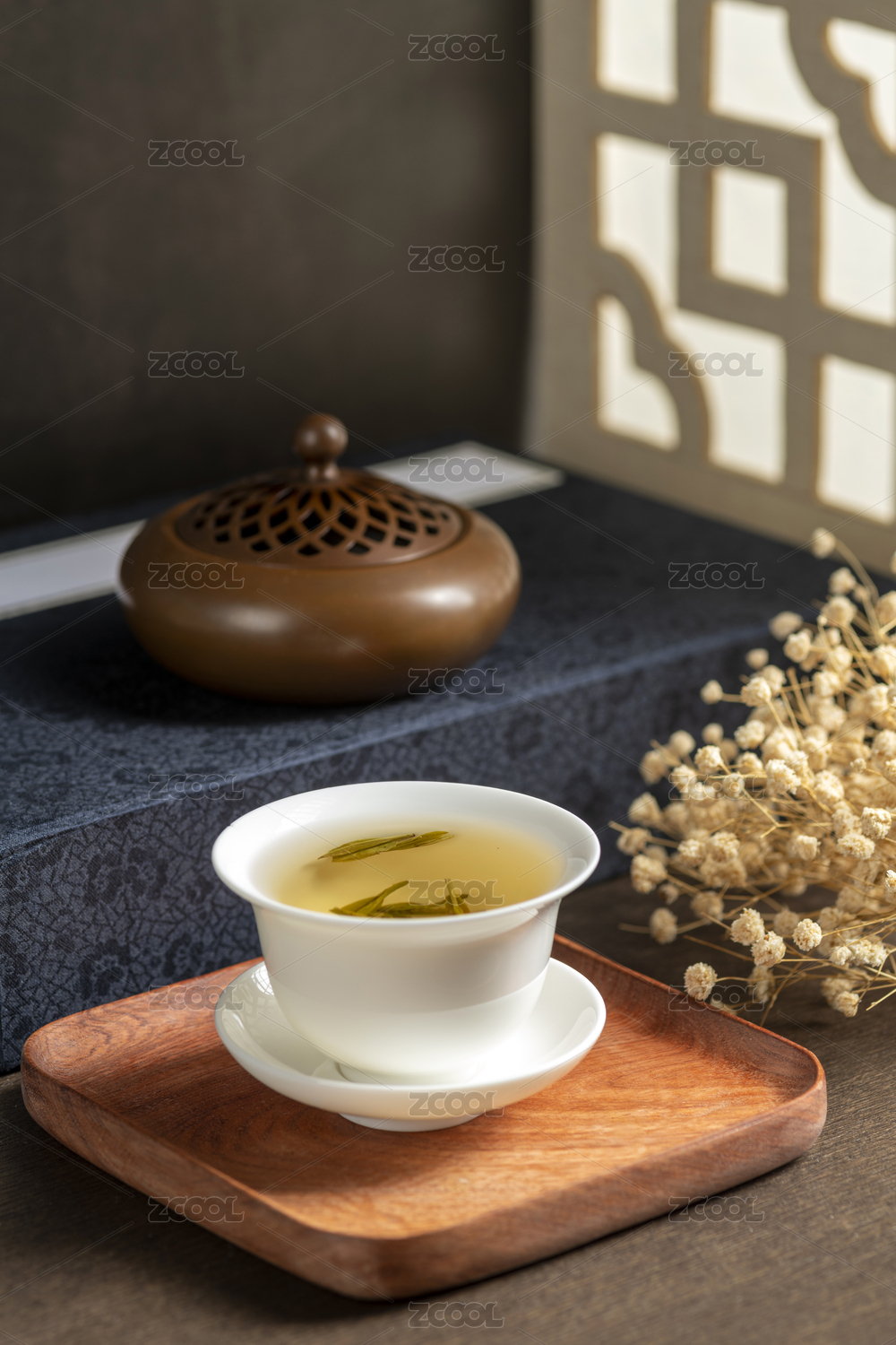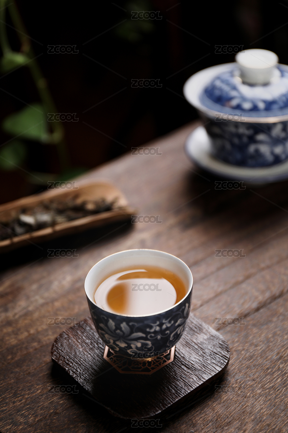 盖碗茶三才杯摆放在窗棂影木桌面上
