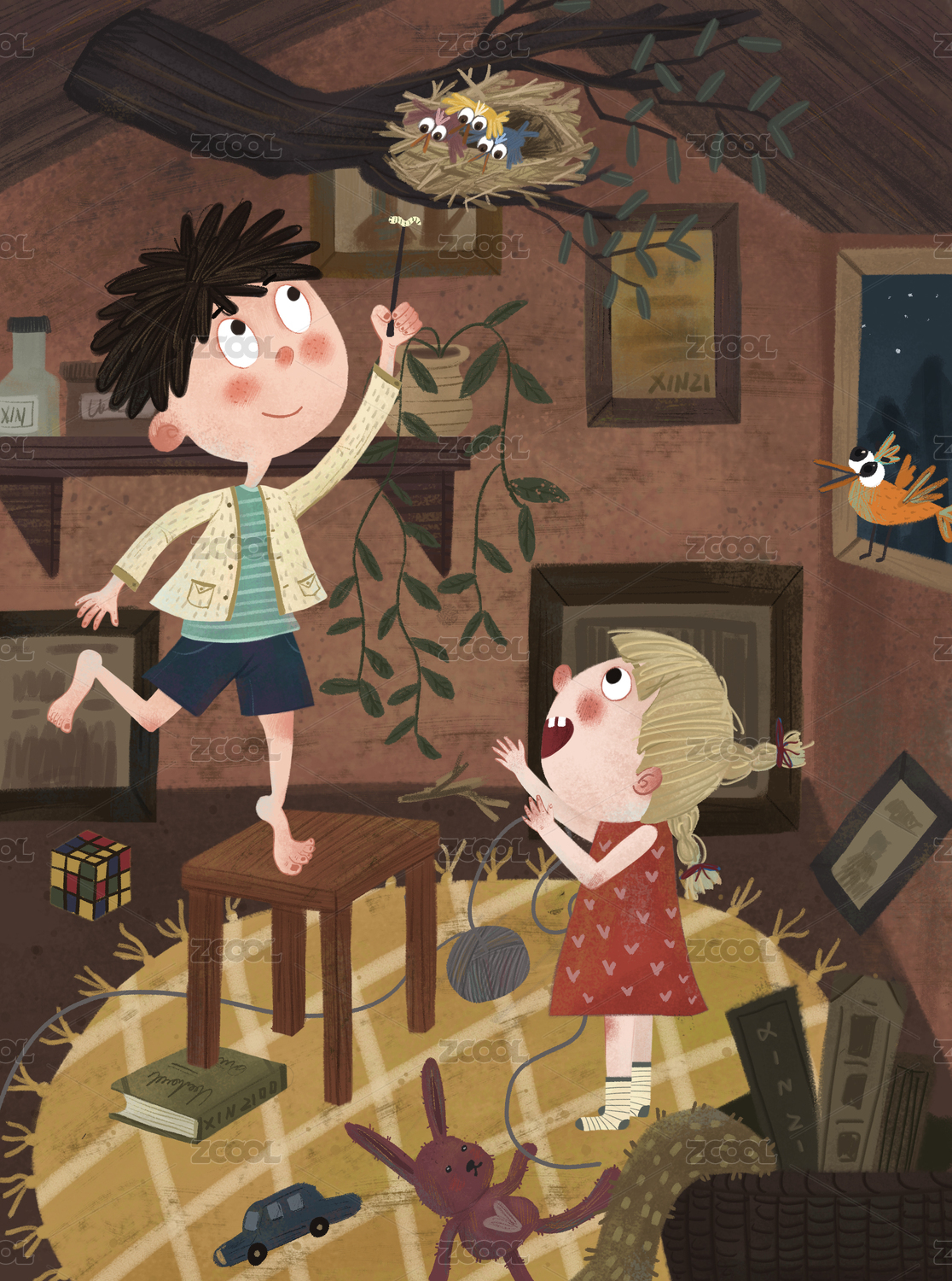 在家玩探险游戏的两个小伙伴