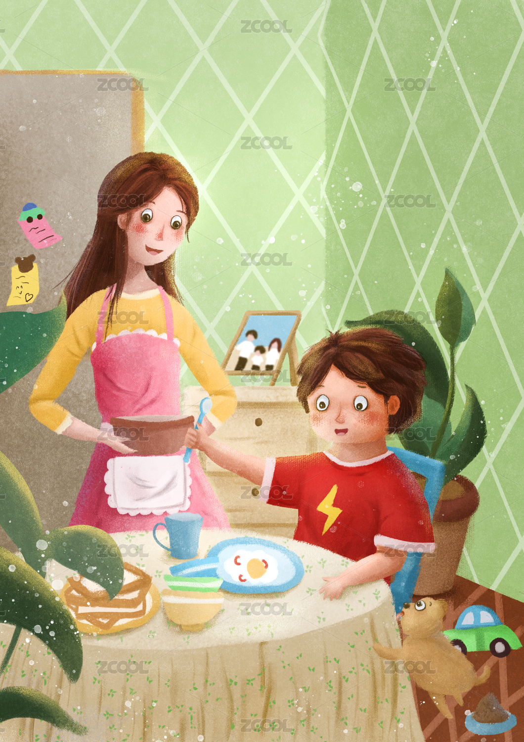 妈妈端汤小男孩吃早餐