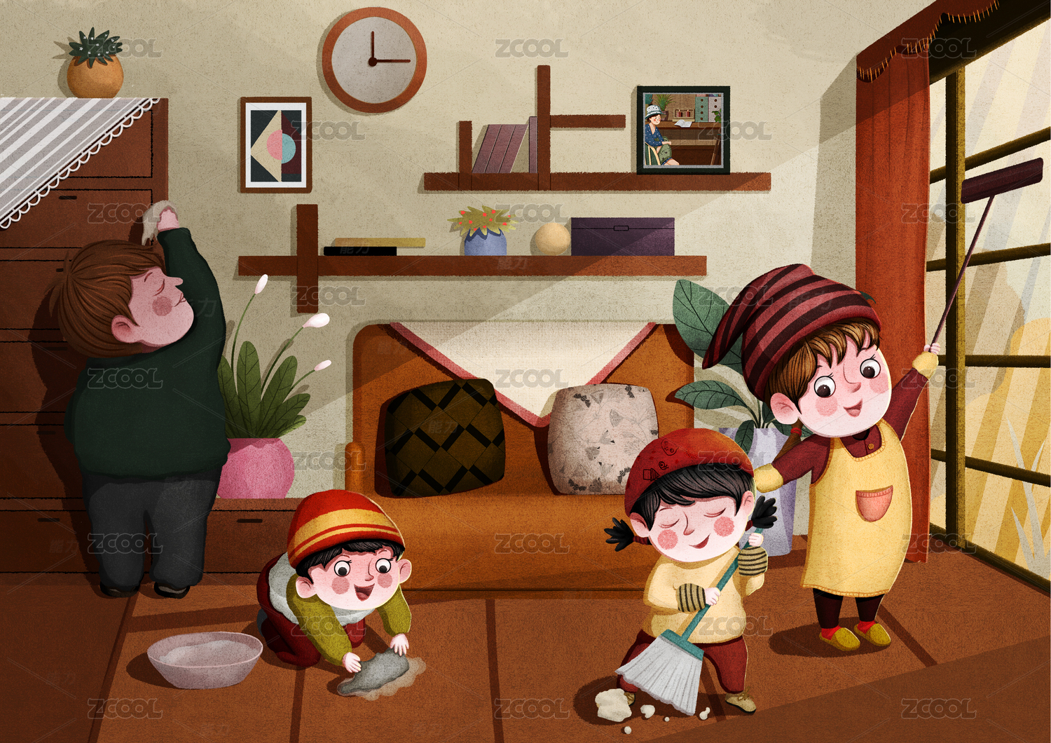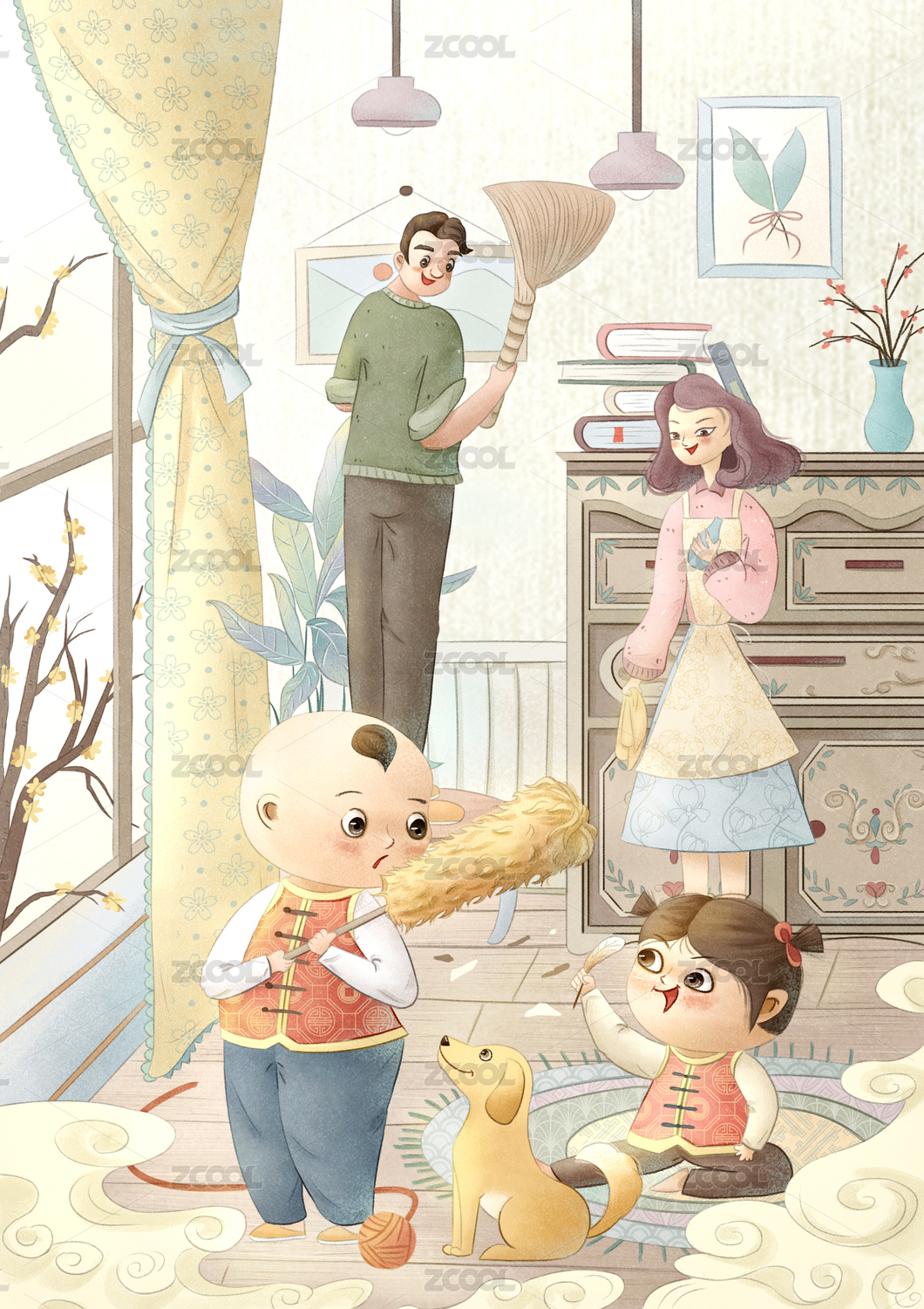 一家四口室内扫房子年俗插画