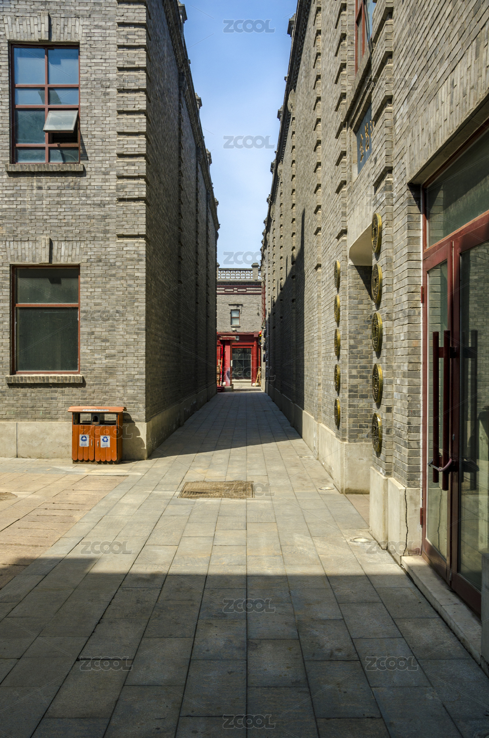 狭窄巷子外蓝天下覆盖植物的老房屋玻璃窗