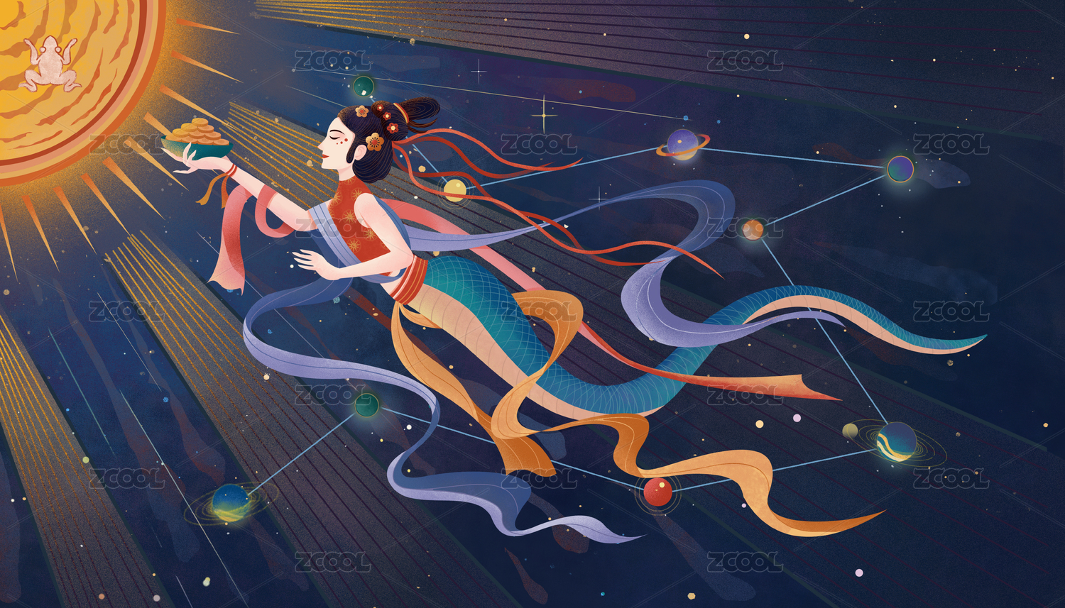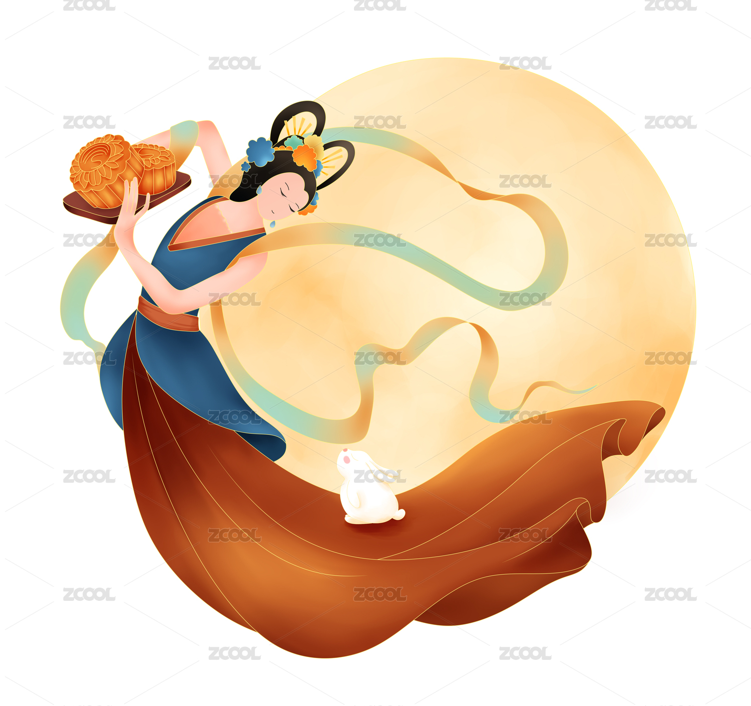 中秋,敦煌画风,嫦娥场景,嫦娥,节日元素,元素,素材,中秋节,嫦娥飞天,仙女