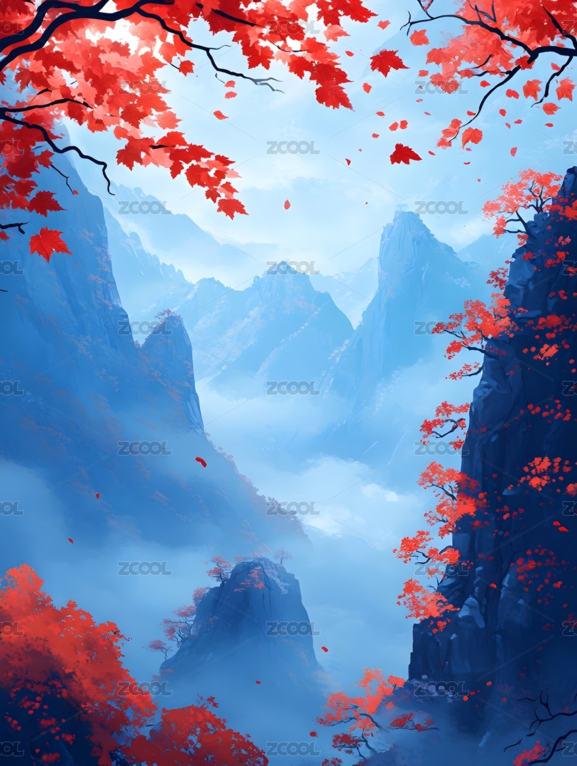 秋山红叶雾中景