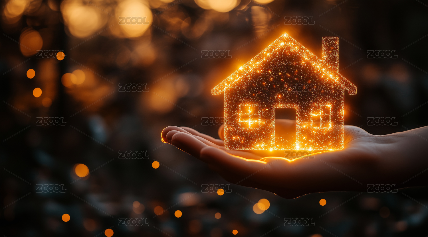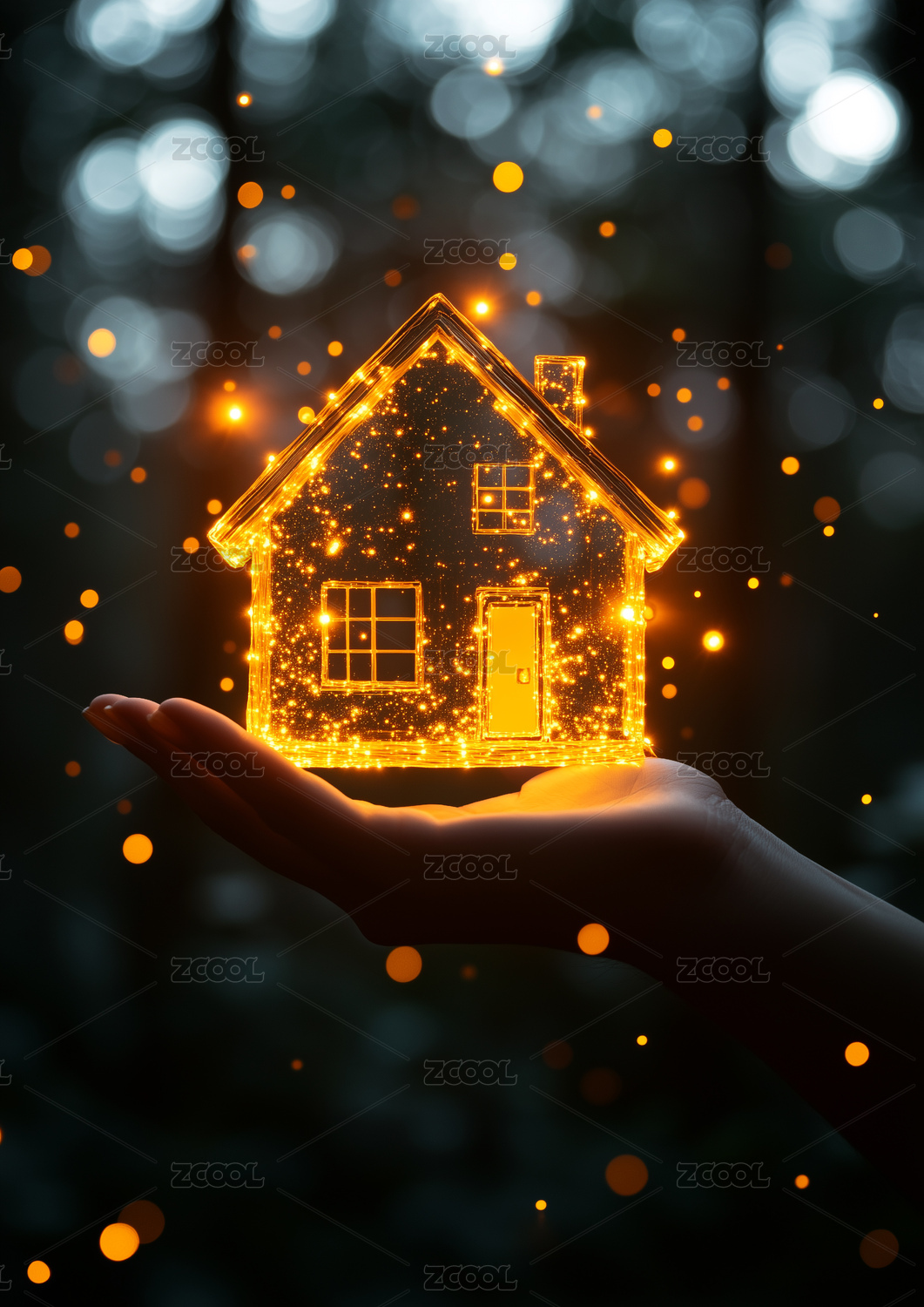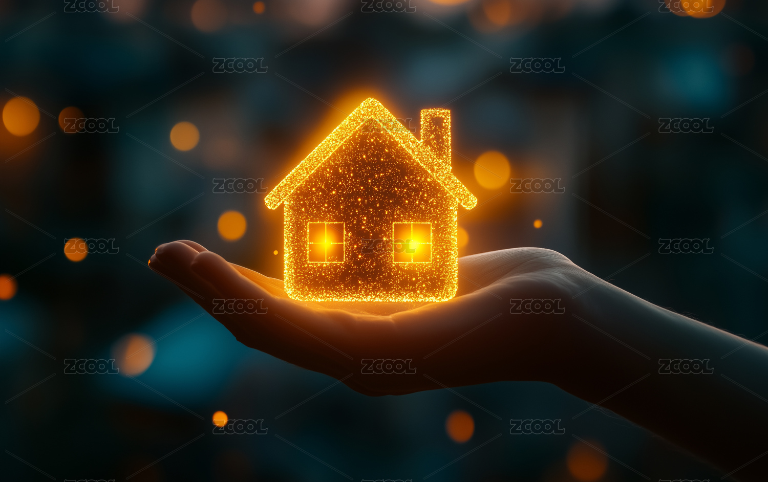 数字,影像,手捧,房屋,金色,光芒,三维,场景,光斑
