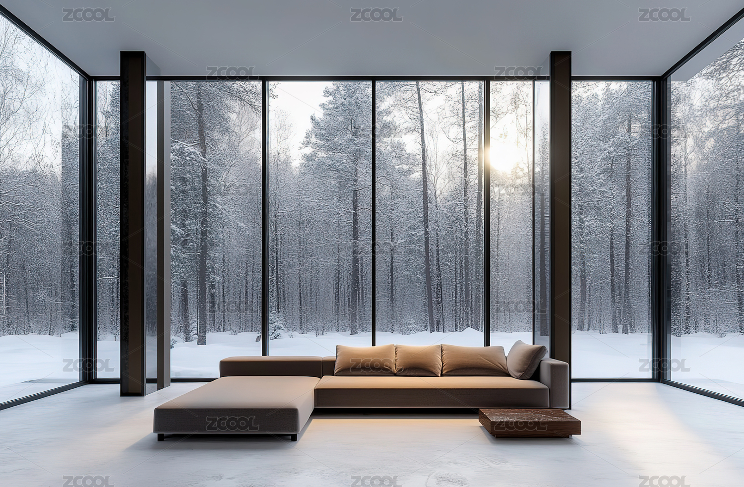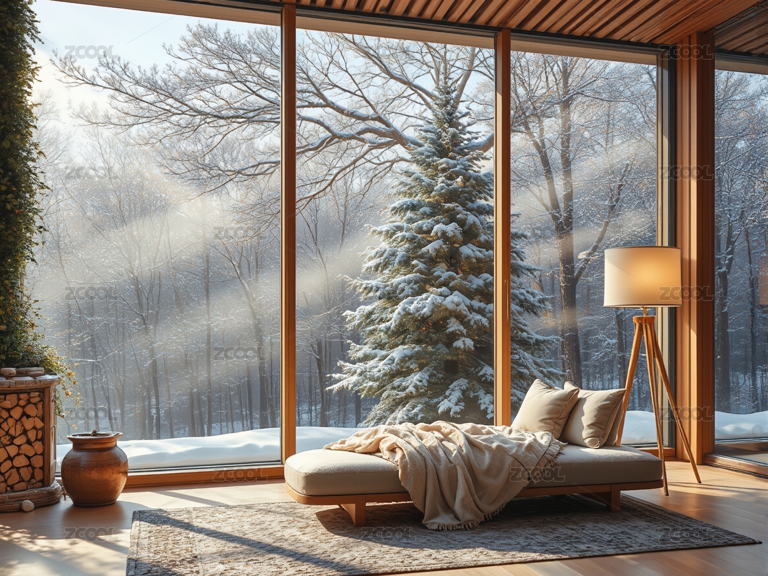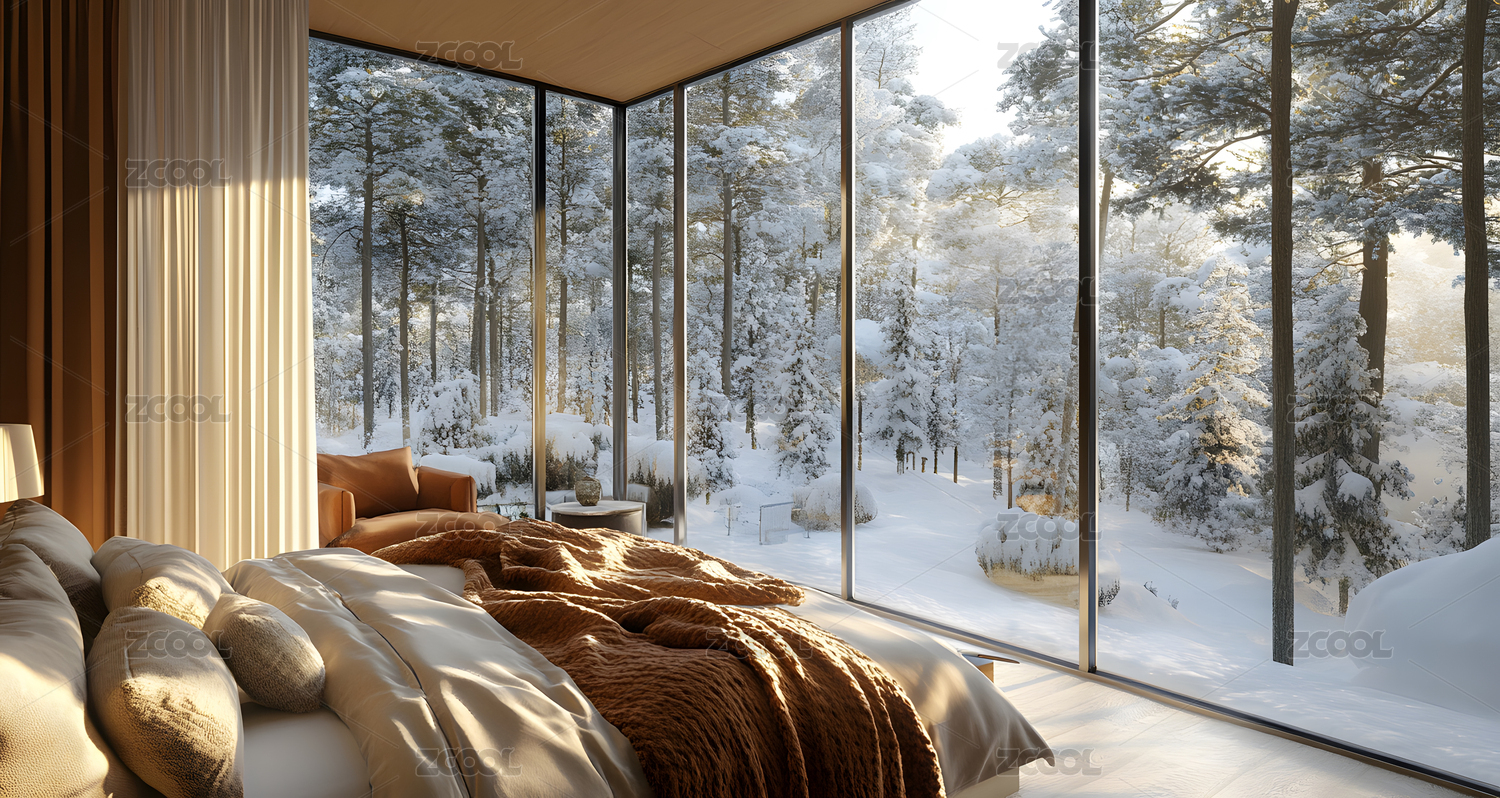 室内,房间,床,温馨,舒适,落地,窗户,树木,雪,立冬