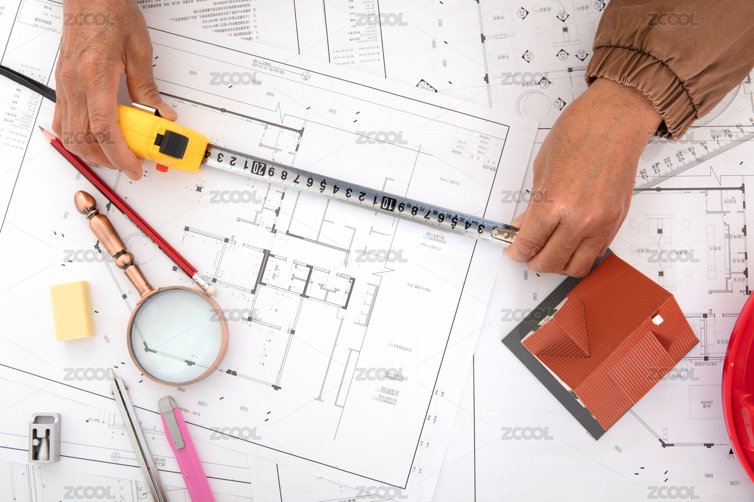 俯视拍摄建筑设计师使用卷尺测量图纸的精度