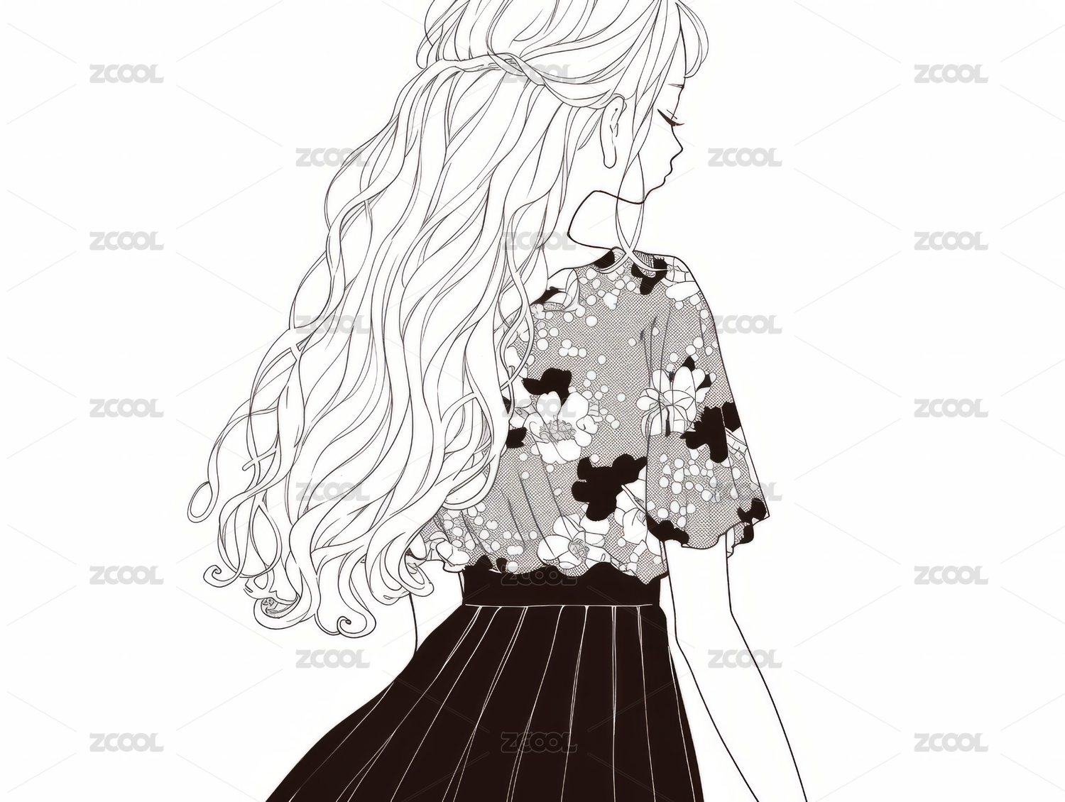 白色背景下比爱心手势的漂亮女孩黑白线稿