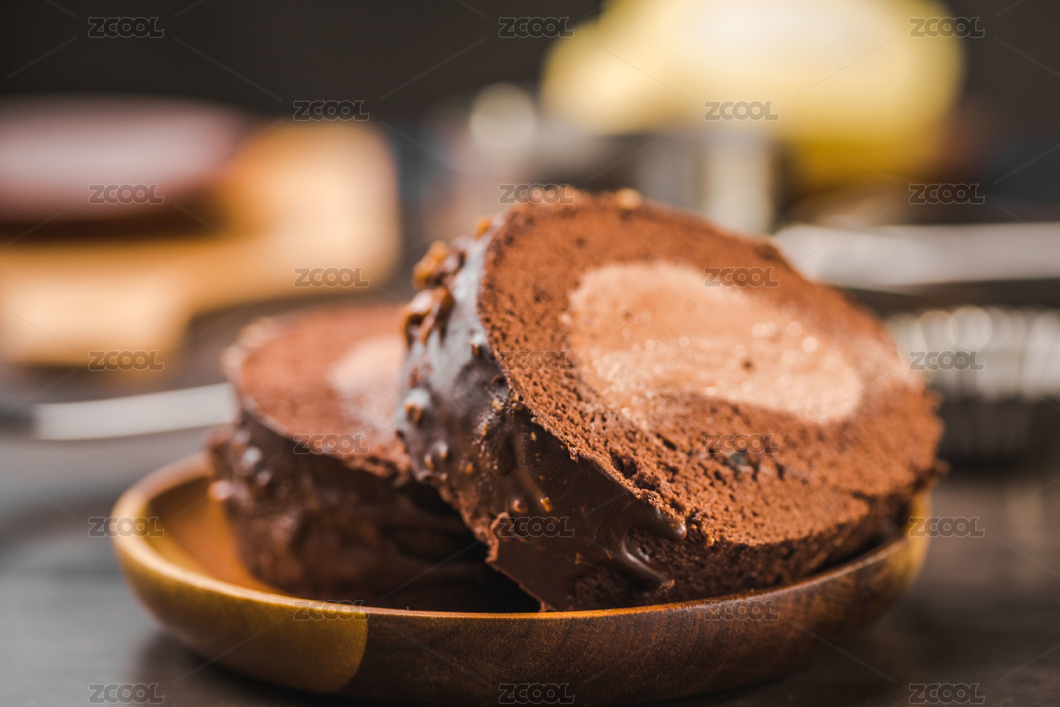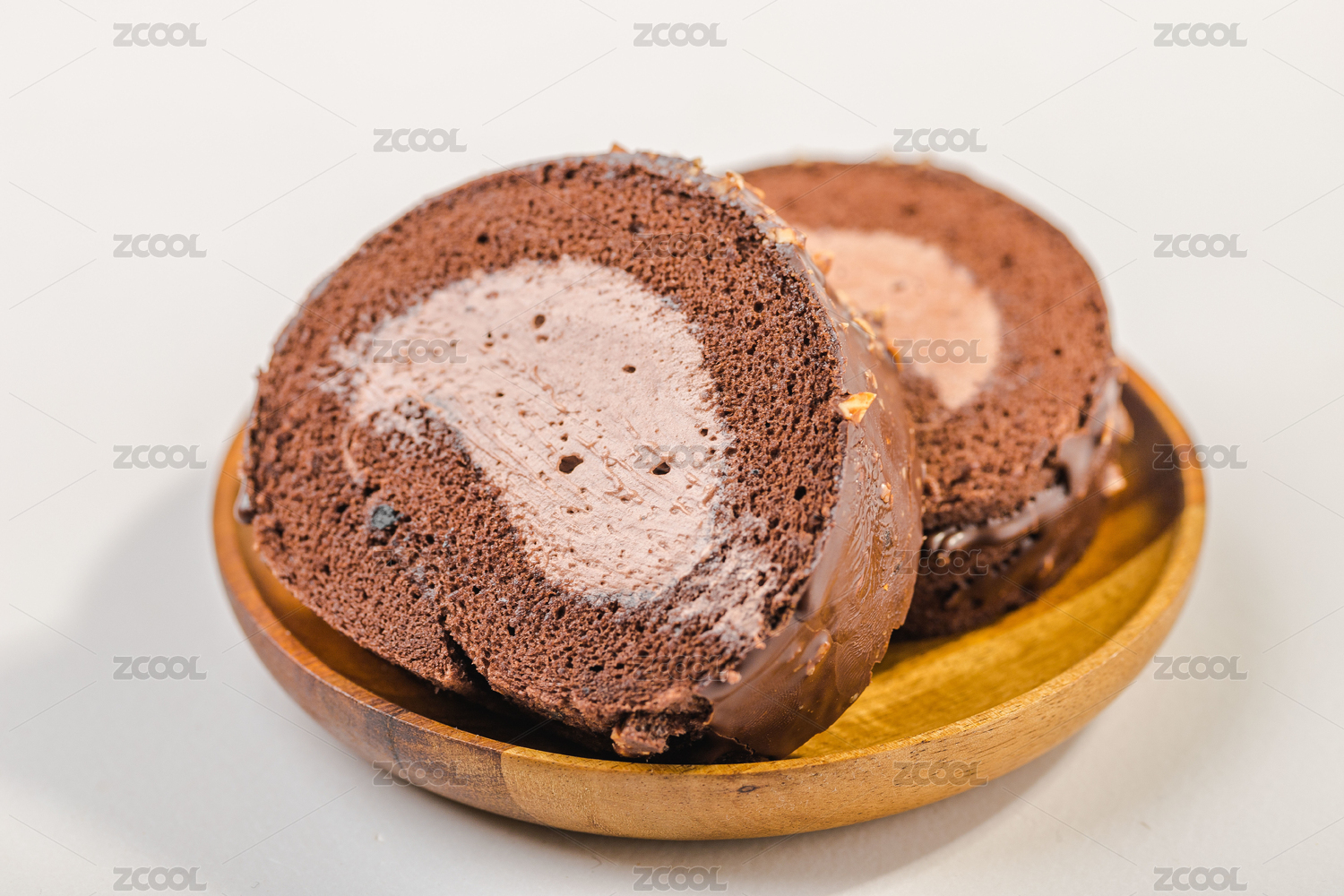 蛋糕卷,蛋黄卷,巧克力卷,坚果碎,巧克力酱,砧板,白色桌面,切开,木盘,点心