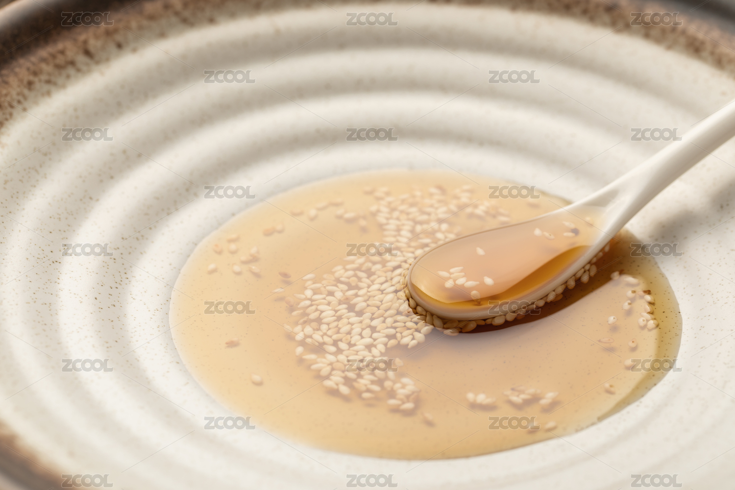 手拿调料杯倒出的芝麻口味的焙煎沙拉汁