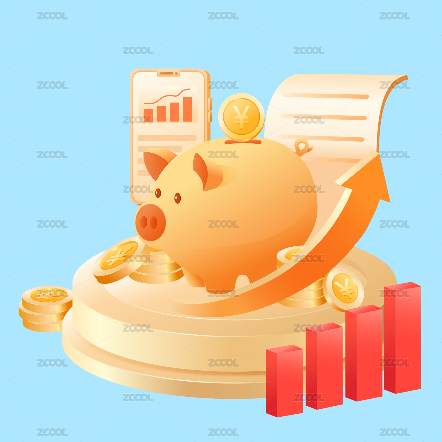 金融理财概念商务插画职员在储蓄罐钱堆砌金币