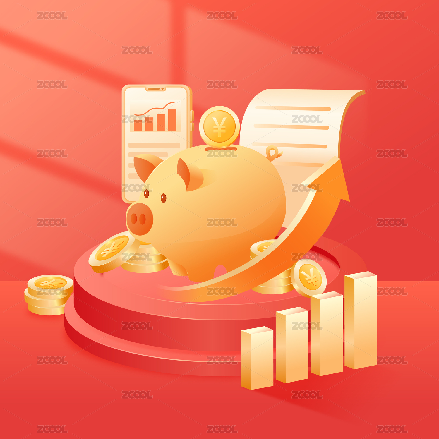 金融理财概念商务插画,职员在储蓄罐钱堆砌金币