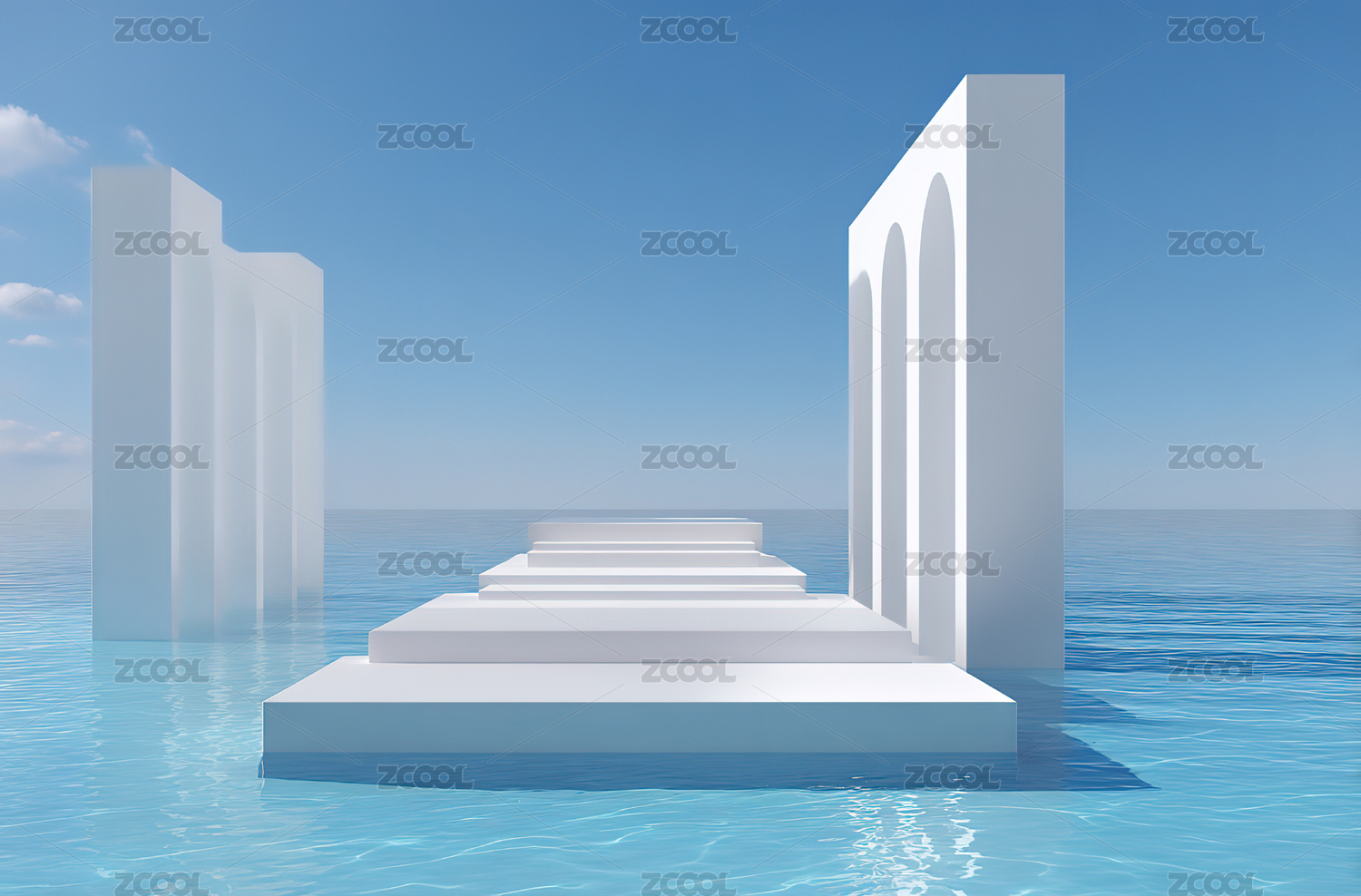 蓝色海洋中的未来城市建筑展台
