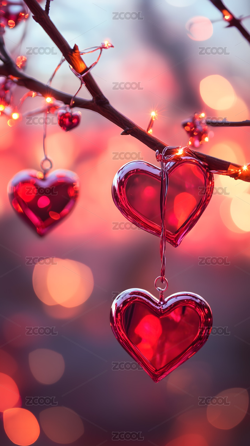 一串红心悬挂在梦幻背景前