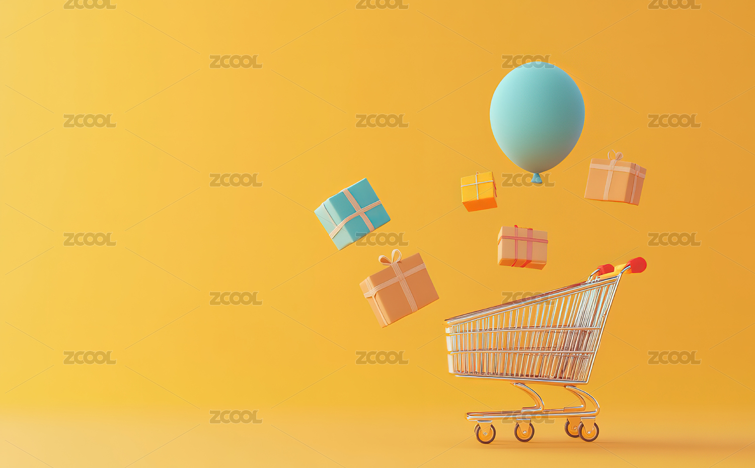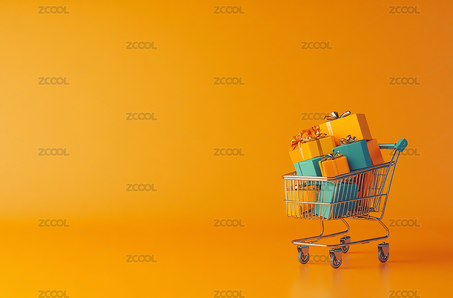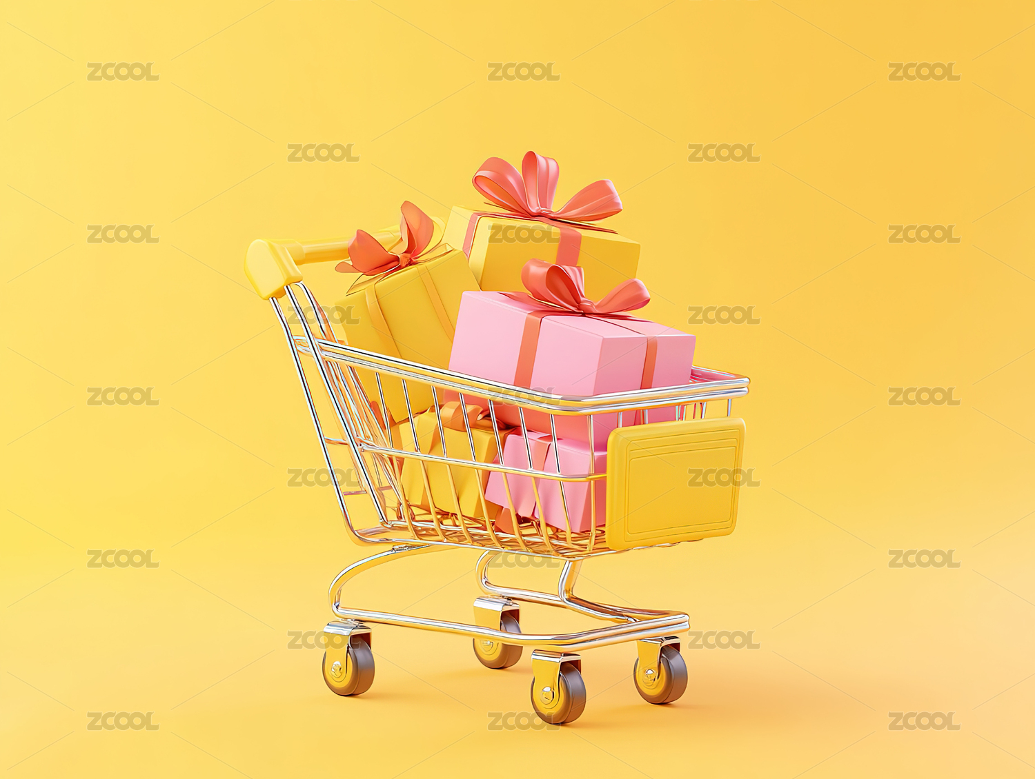 黄色背景下装满礼物盒的购物车