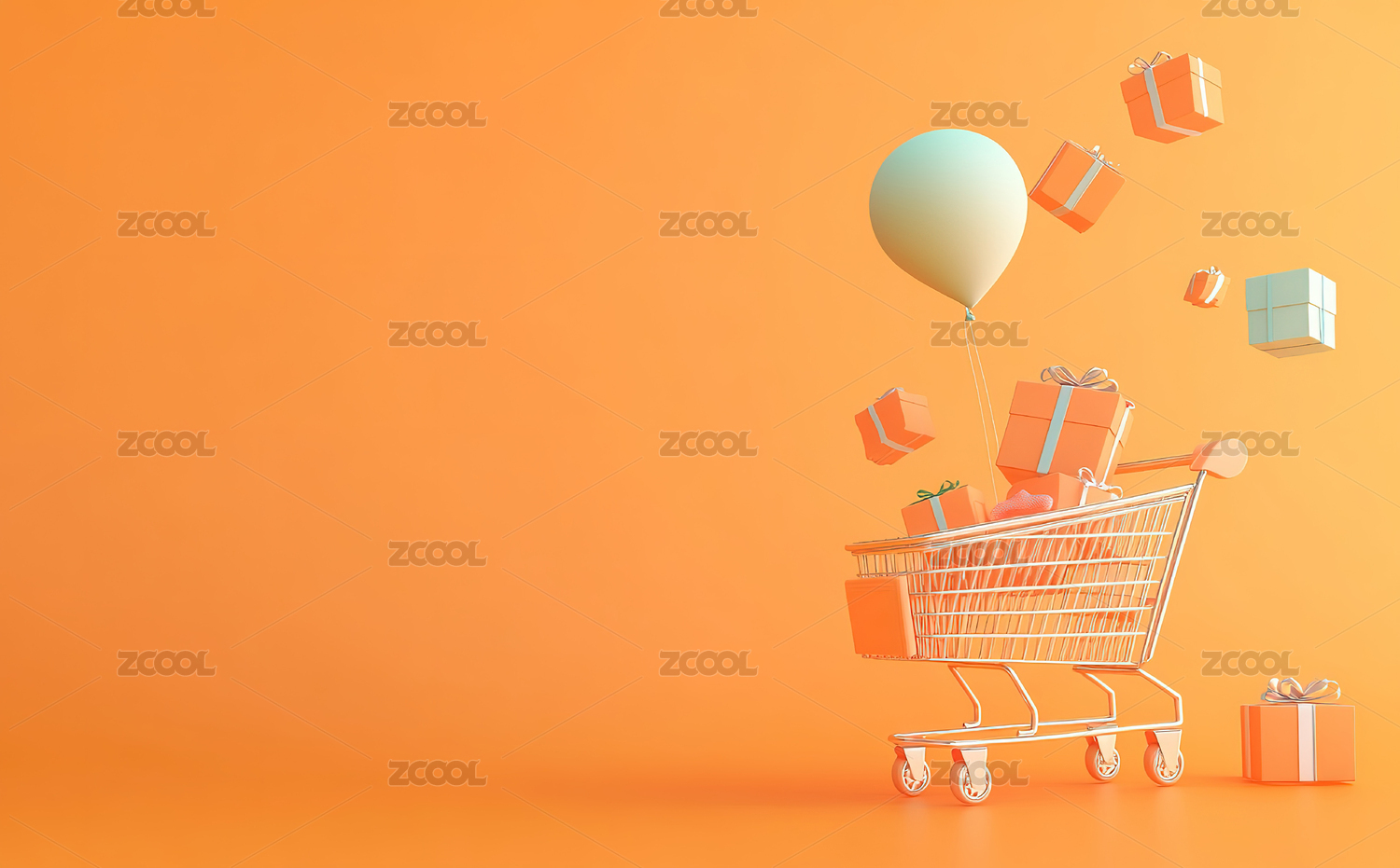 橙色背景下购物车中气球的特写镜头