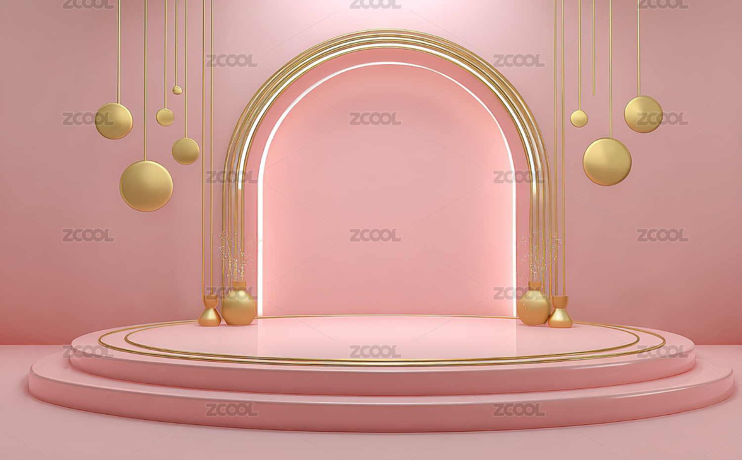 红色展台产品讲台3D背景,圆形金色霓虹灯