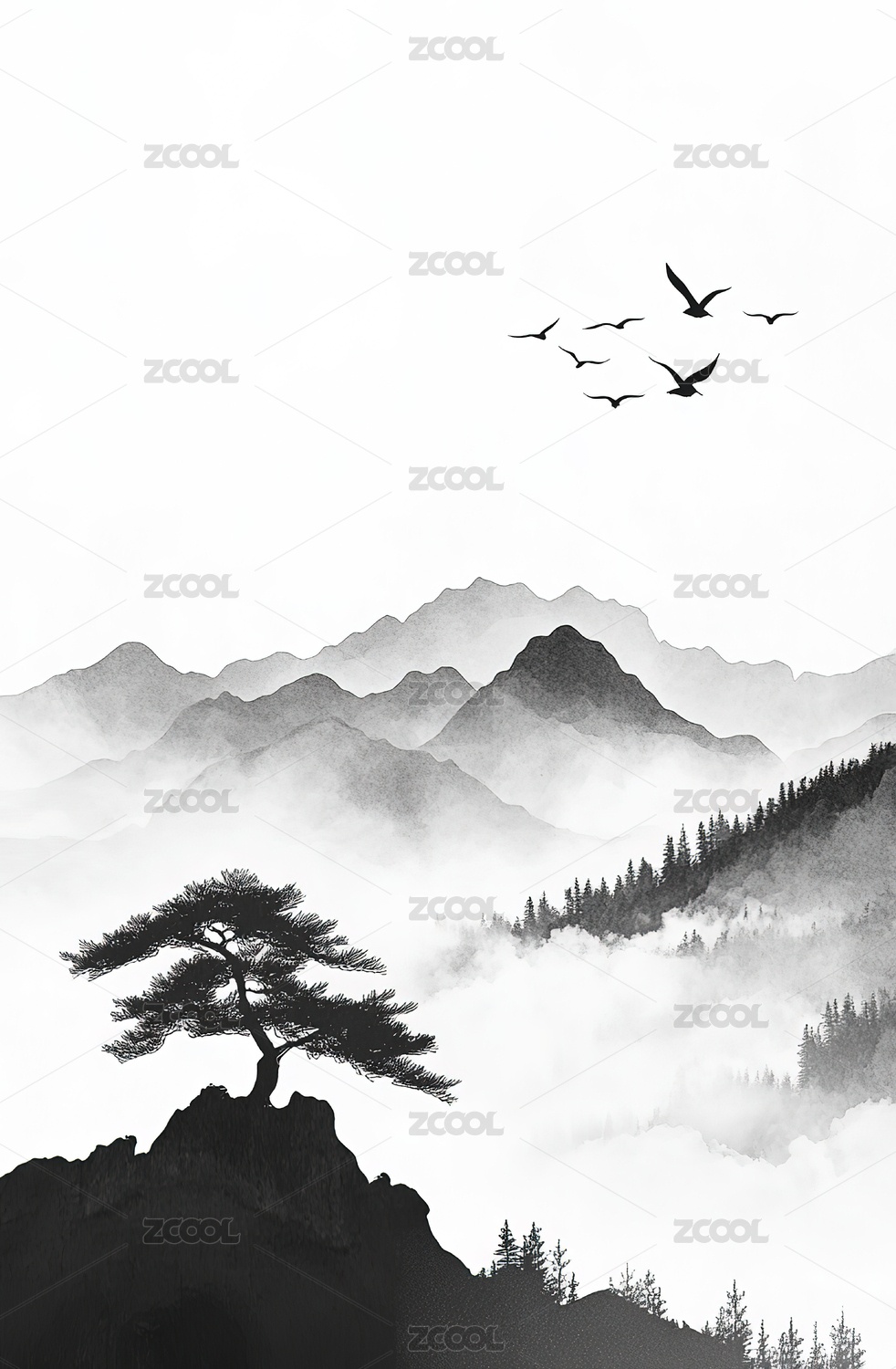 黑白水墨简约山水插画