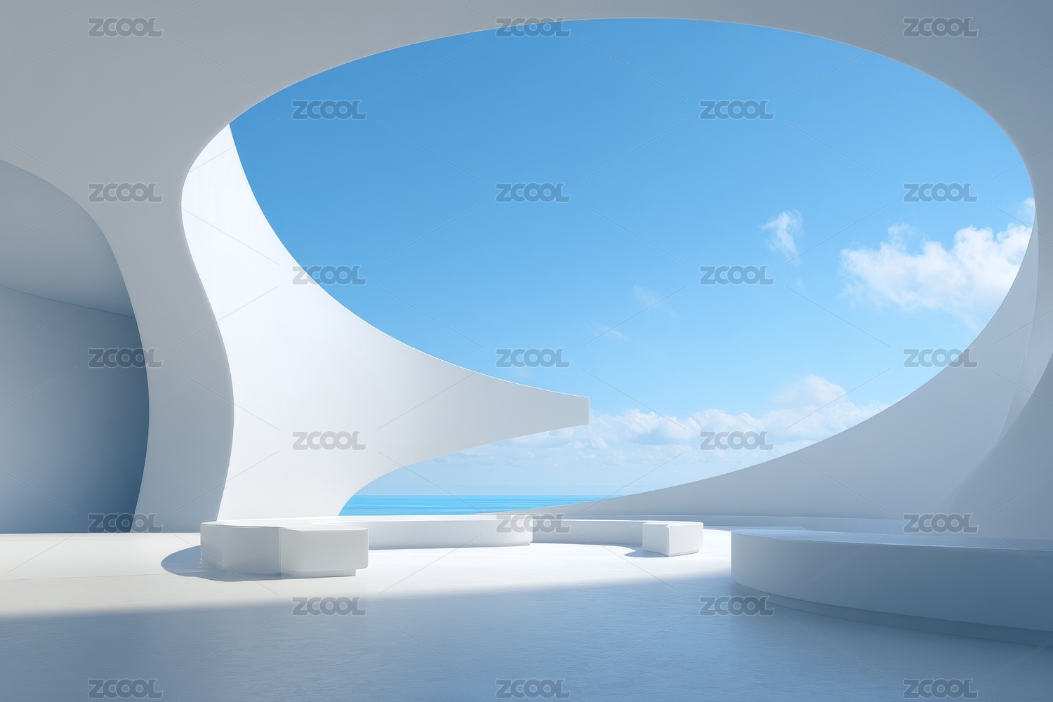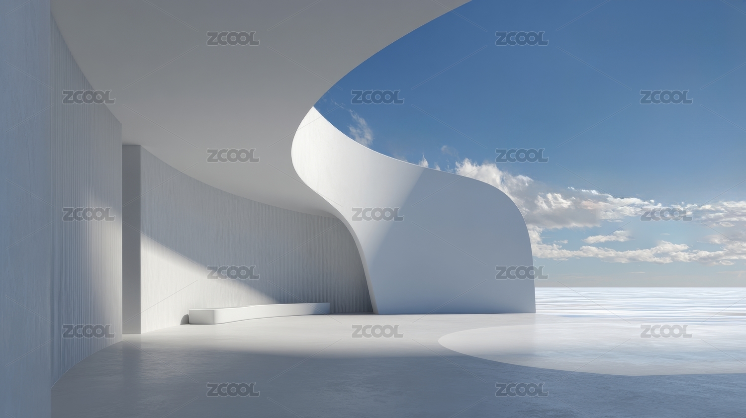 纯白镜面海滨建筑空间