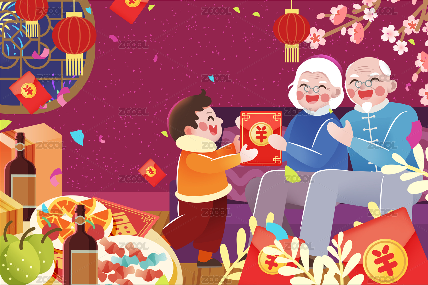 手绘,卡通,线上拜年,春节,节日,喜庆,红色,老人,家人,家庭