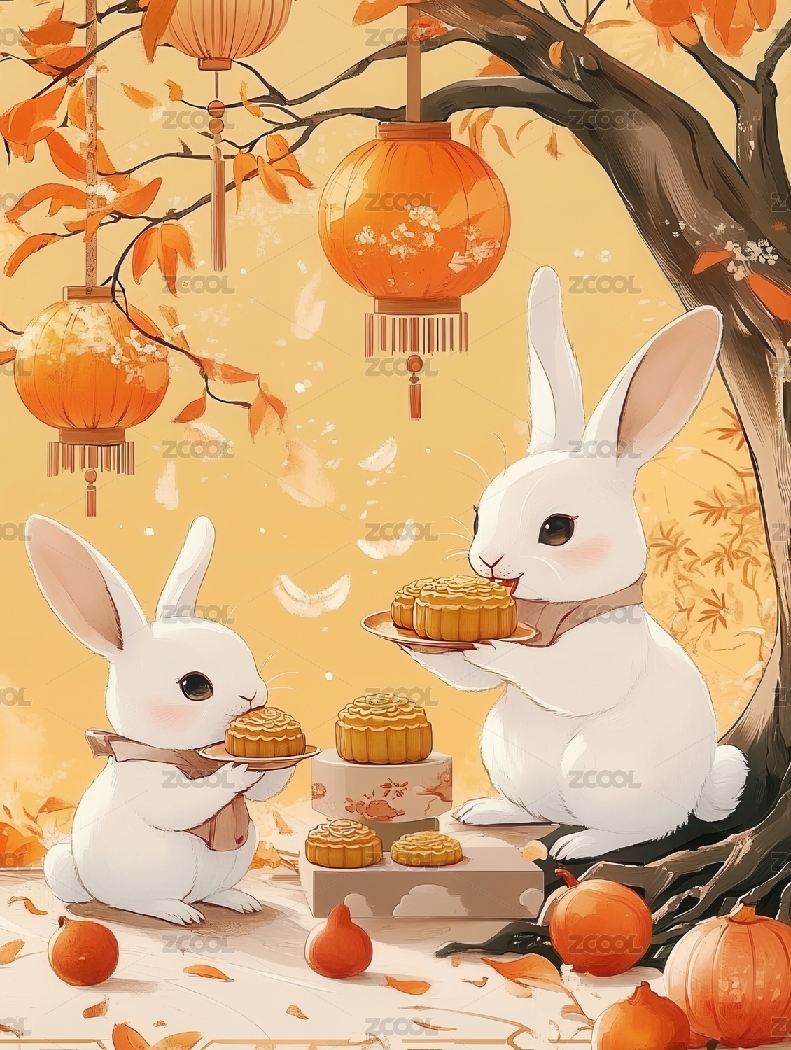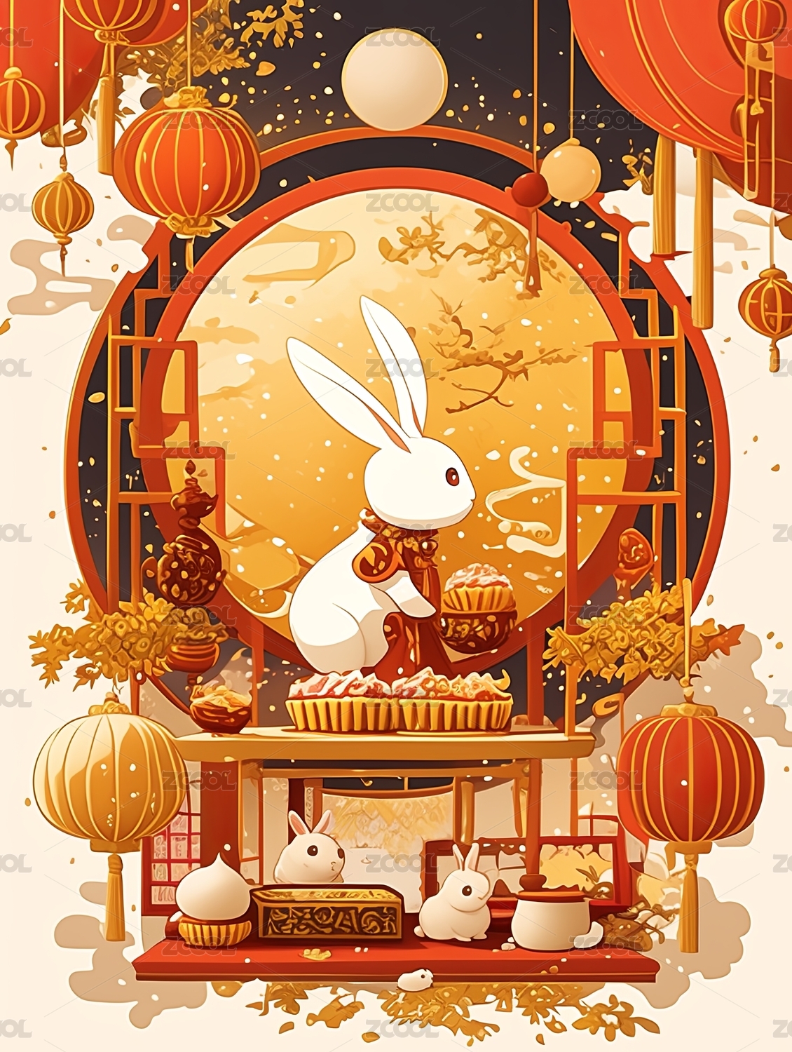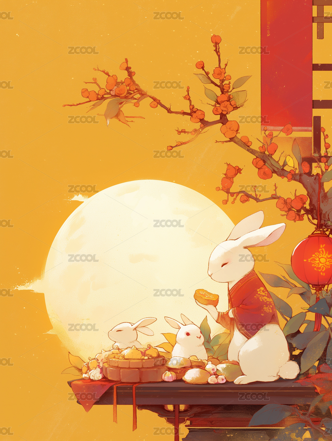 中秋,中秋节,玉兔,兔子,月饼,月亮,满月,桂花树,插画,可爱