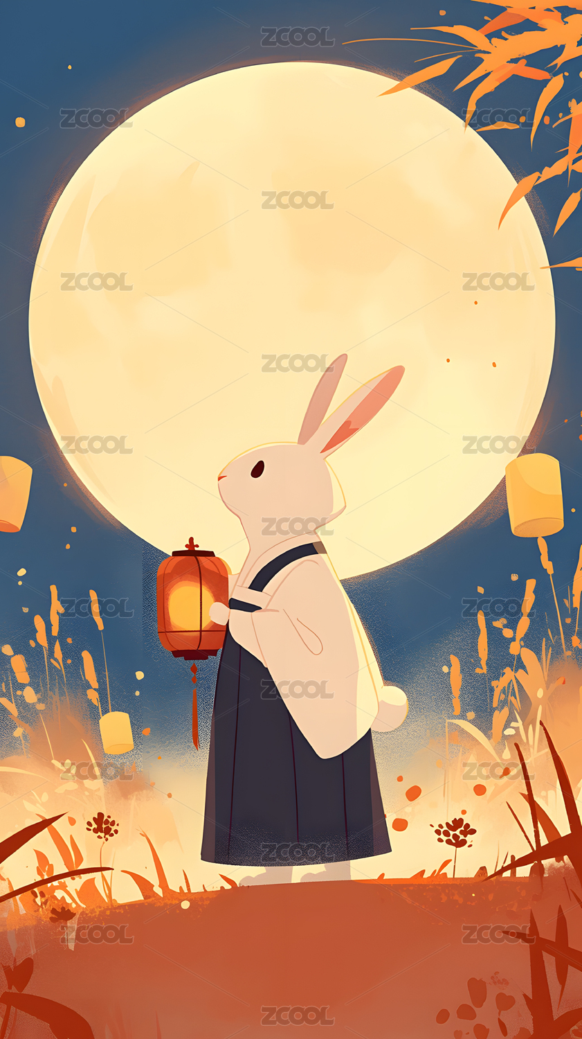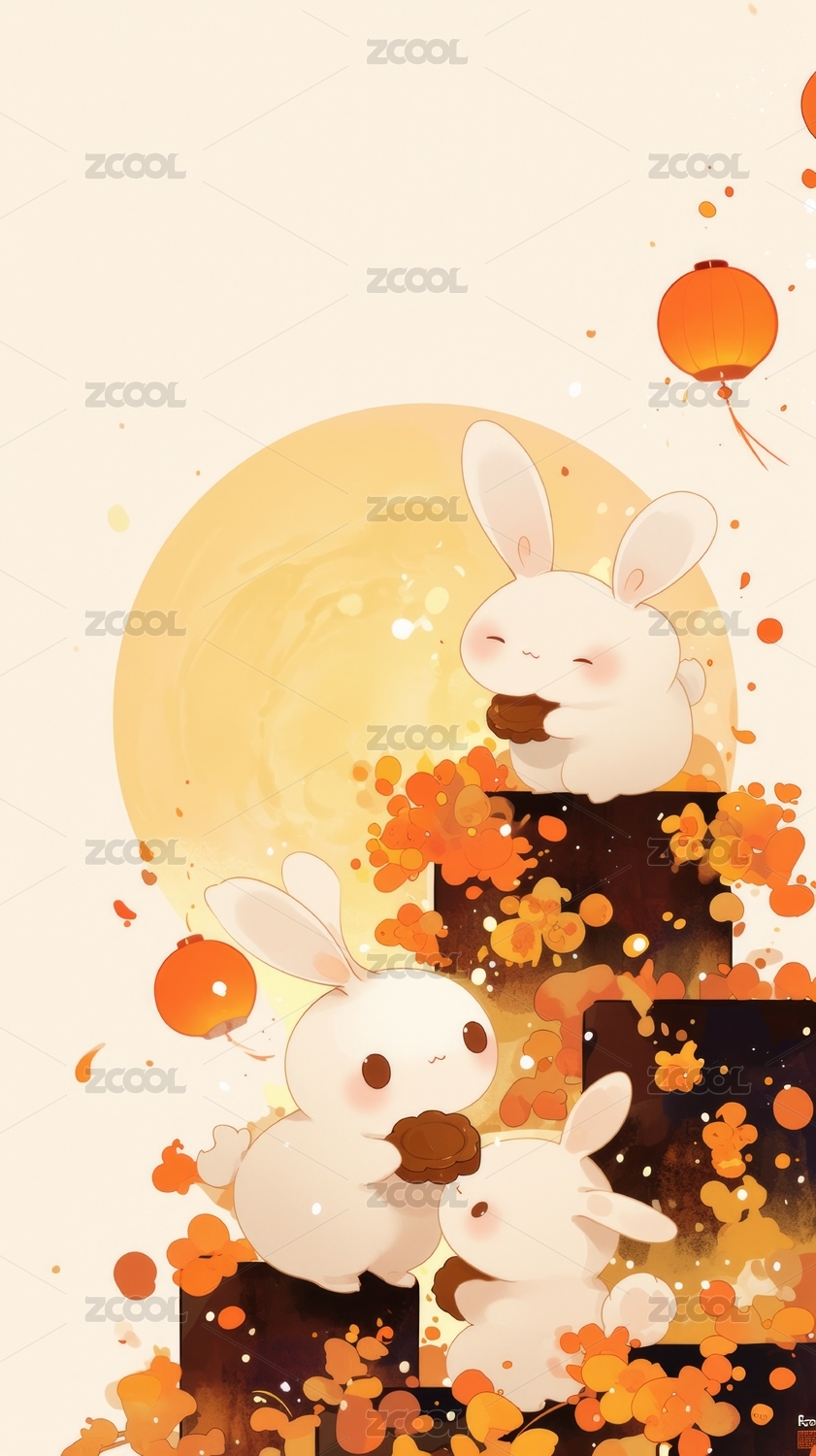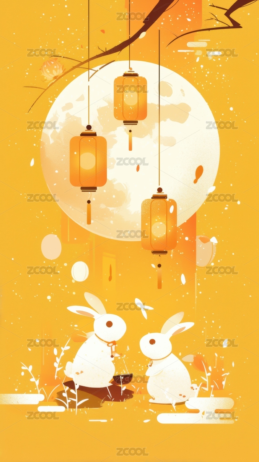 中秋,中秋节,玉兔,兔子,月饼,月亮,满月,桂花树,插画,可爱