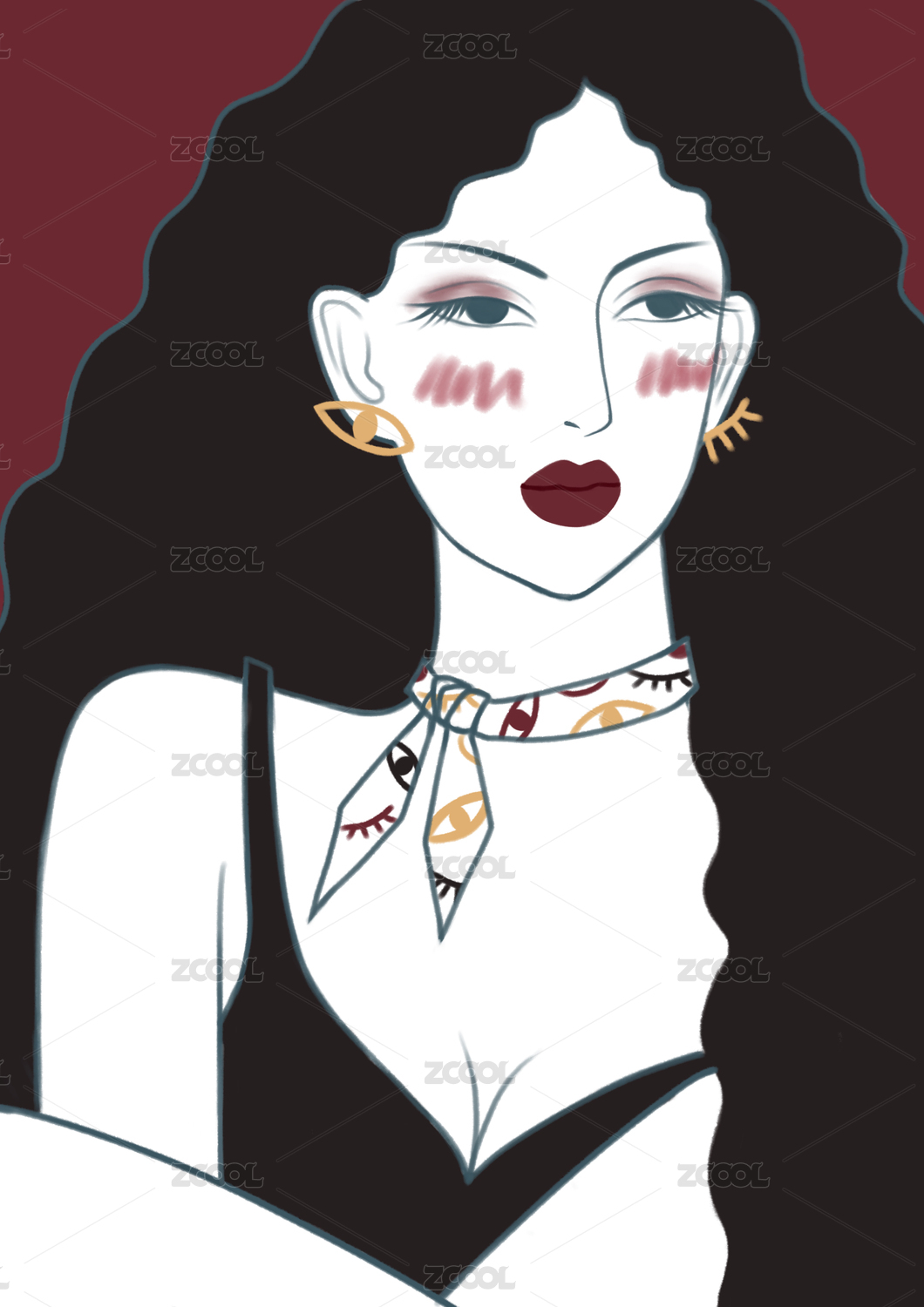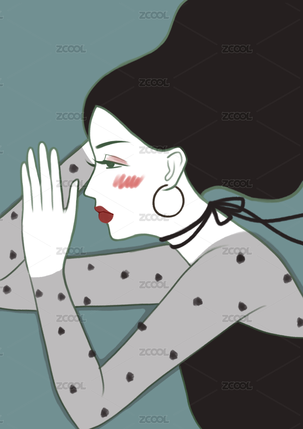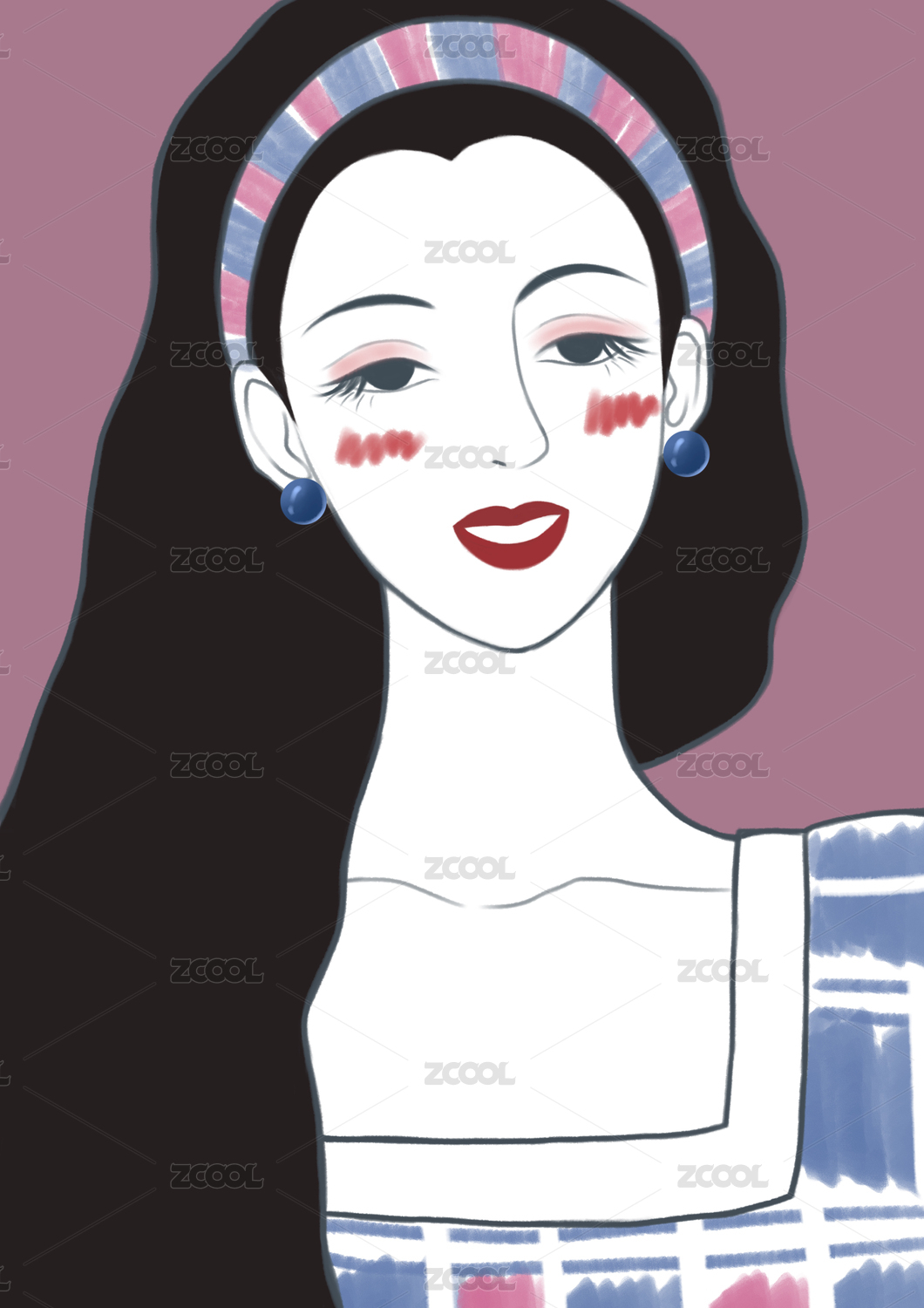 夏天黑头发黄皮肤东方女性头像扁平插画绘画
