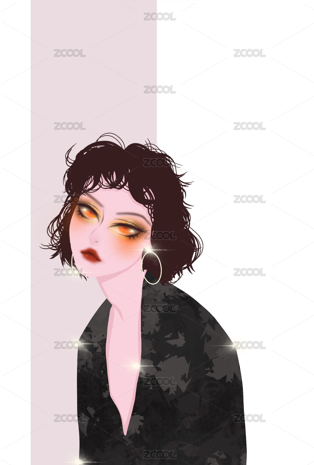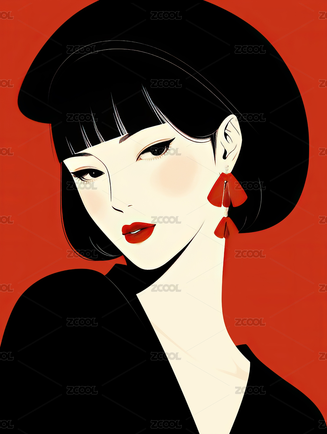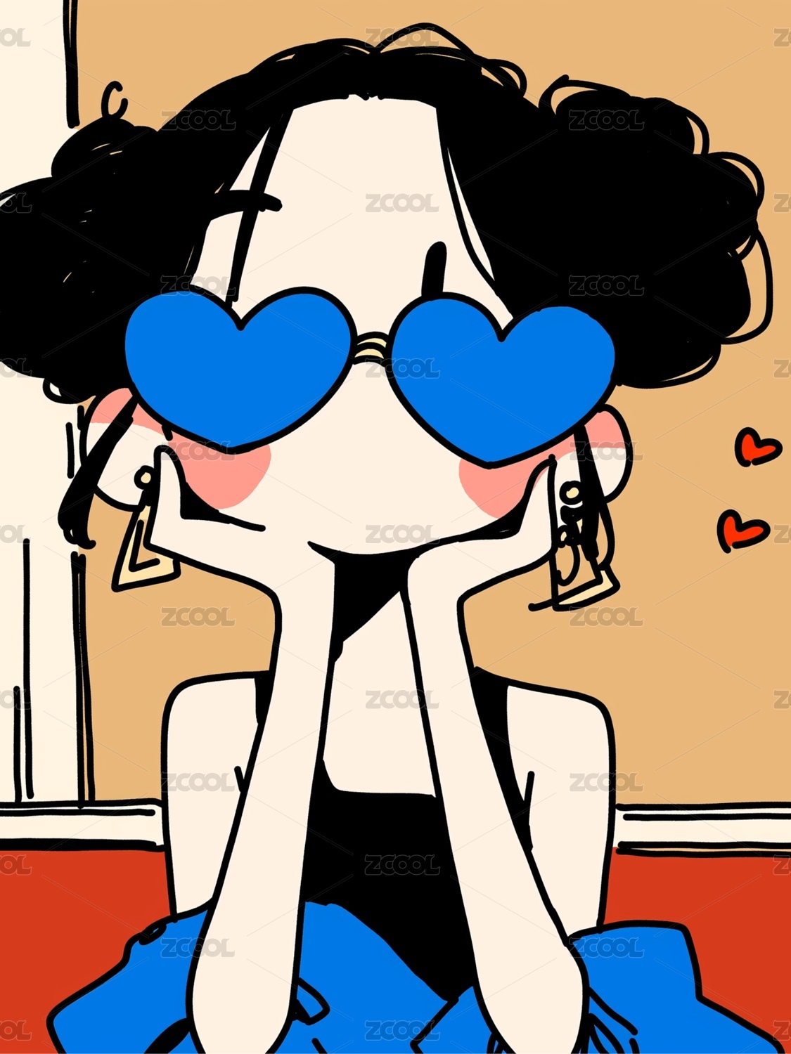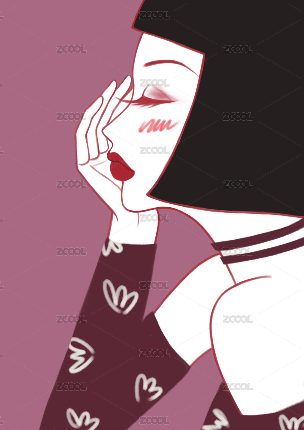 夏天黑头发黄皮肤东方女性头像扁平插画绘画