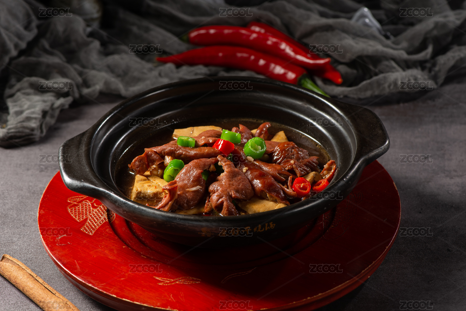 黑色砂锅装的砂锅肥肠摆放在麻布垫子上