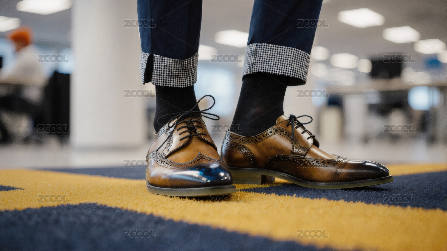 在木地板上穿着皮鞋和彩色袜子的两只脚