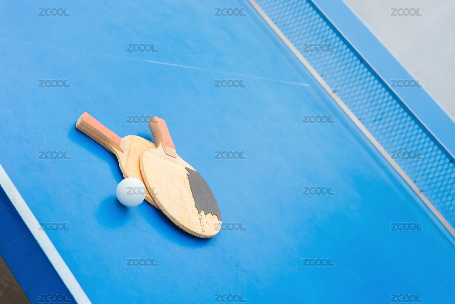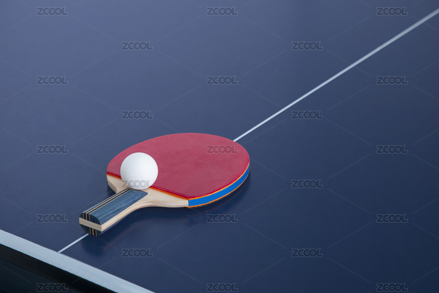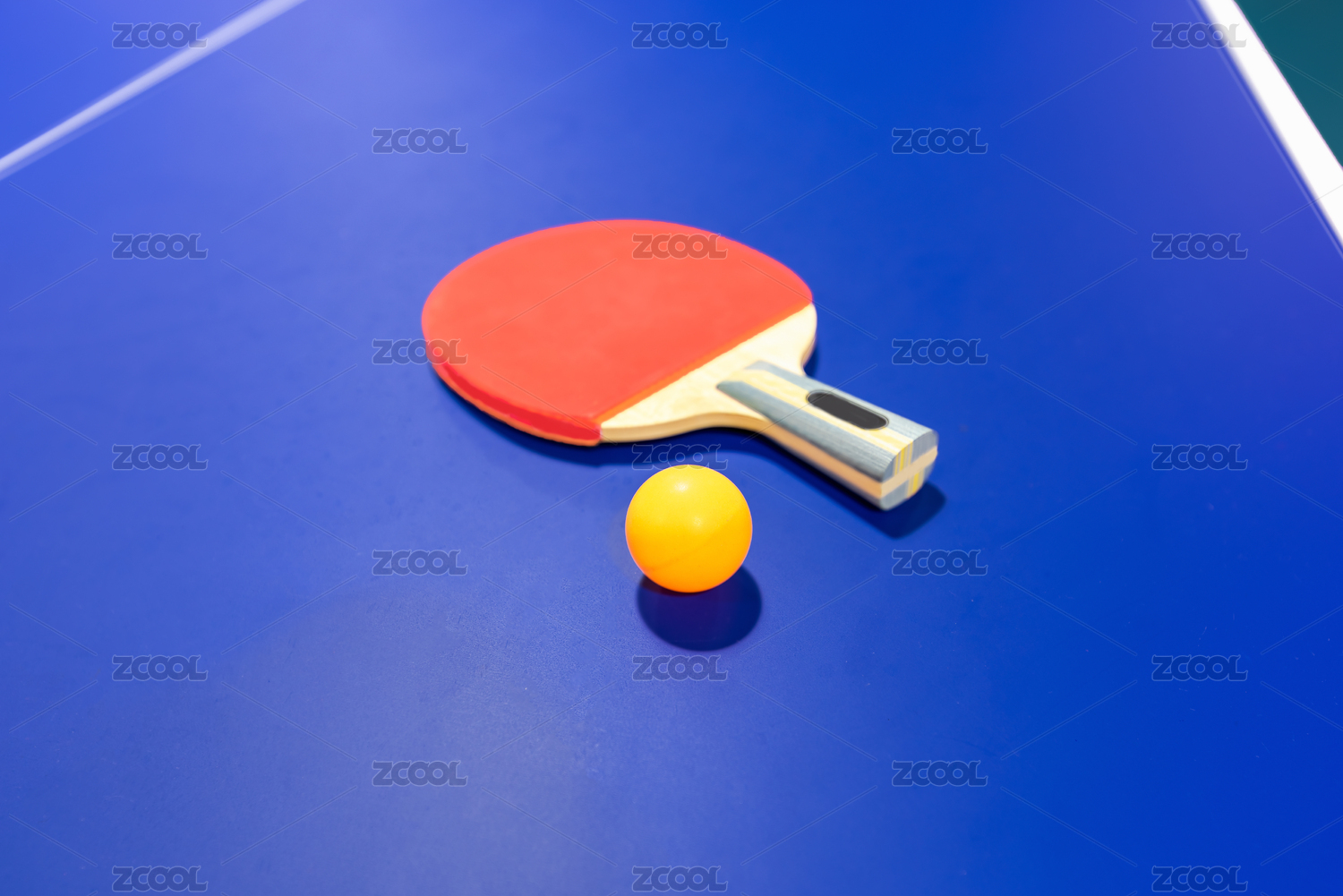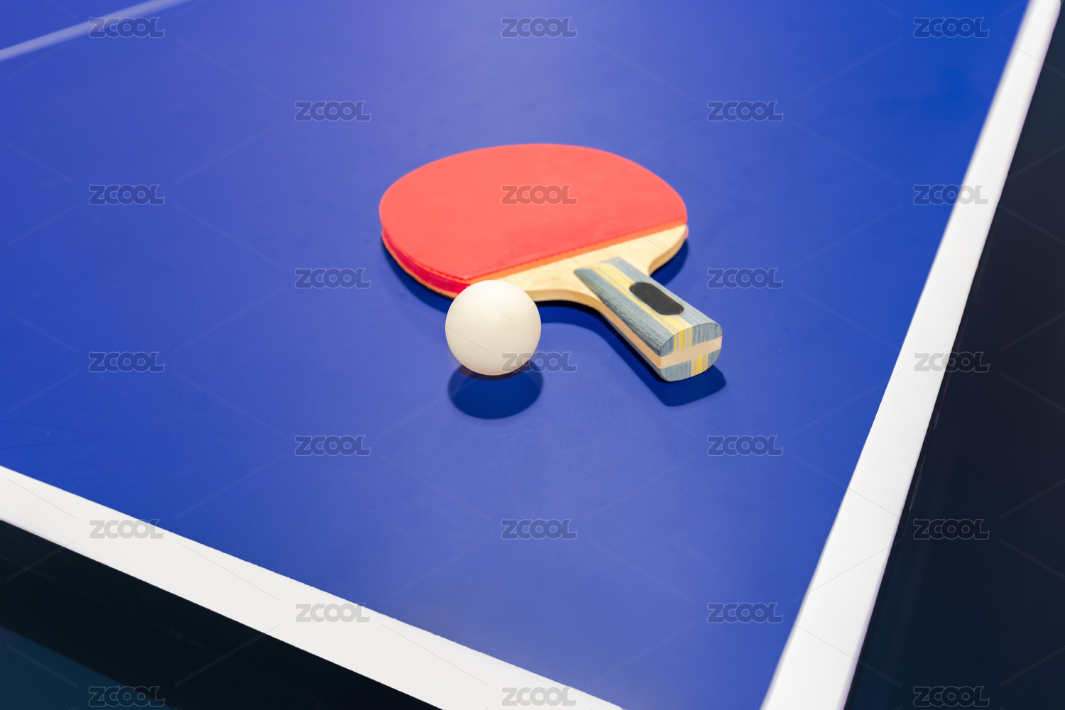 乒乓球桌子上放着一块乒乓球拍和一个白色乒乓球