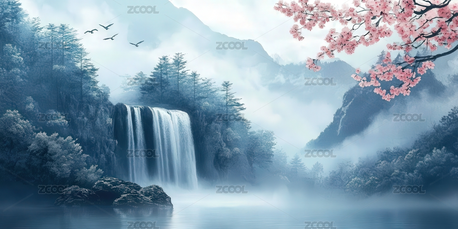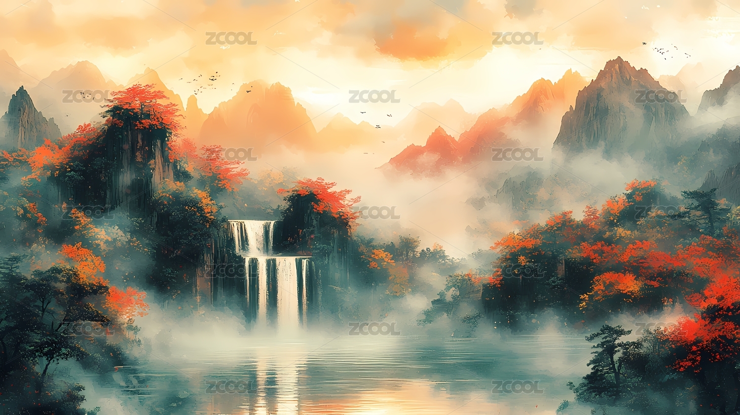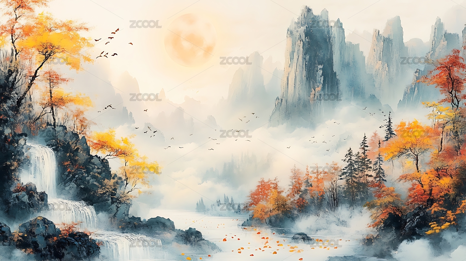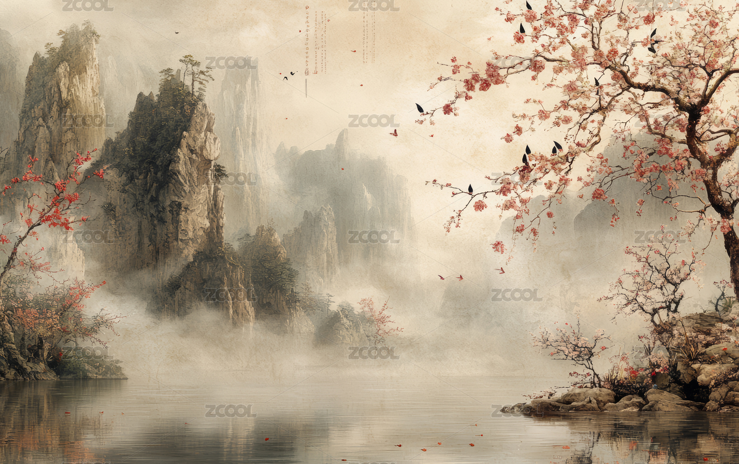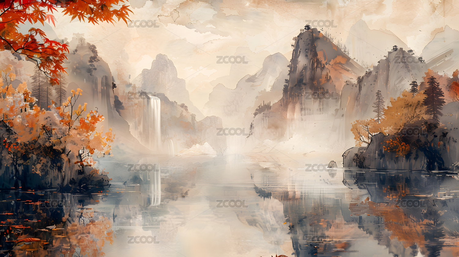 中国元素,中国文化,传统,古典,山水画,国风,极简,山岳,湖,船
