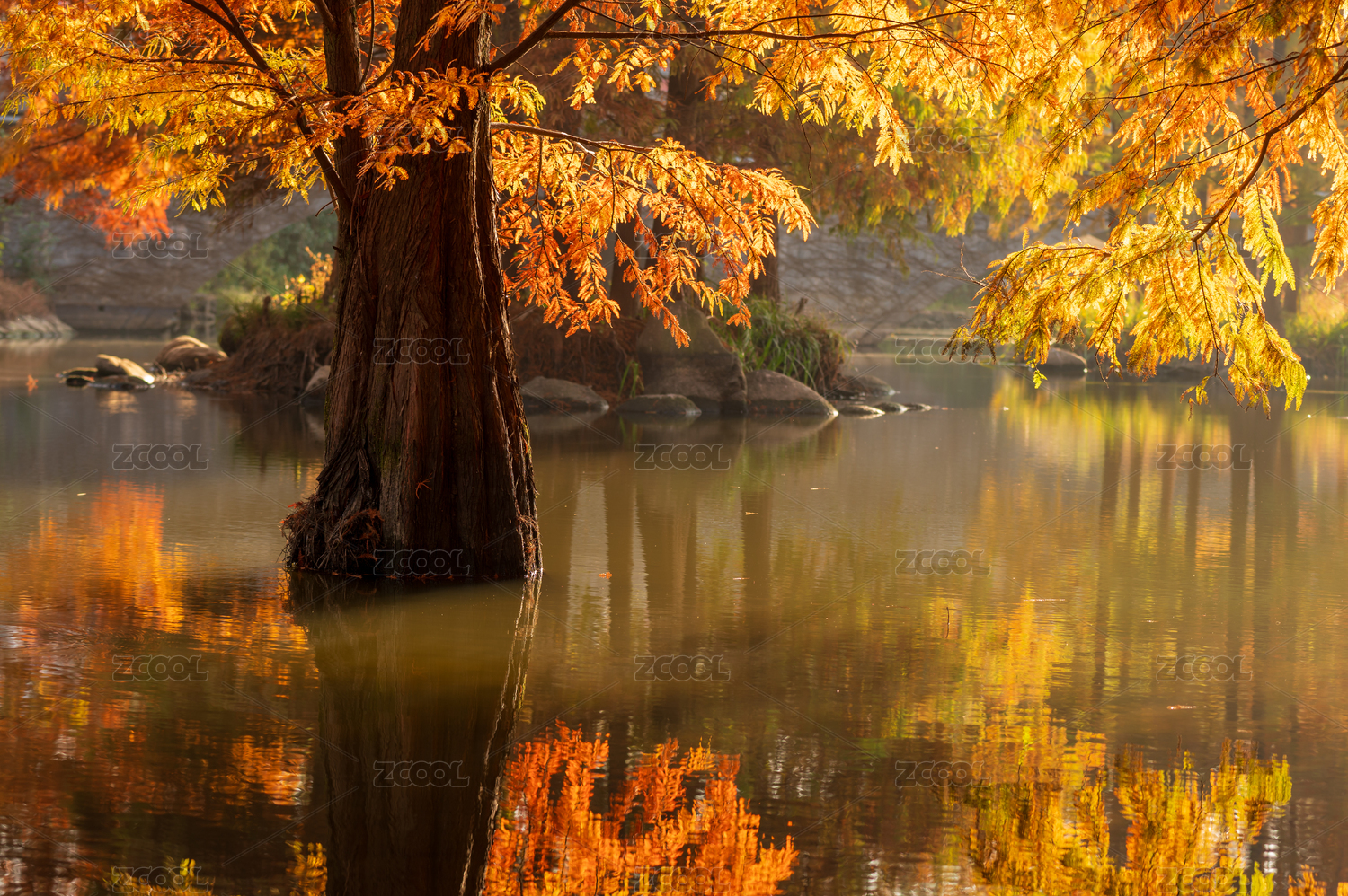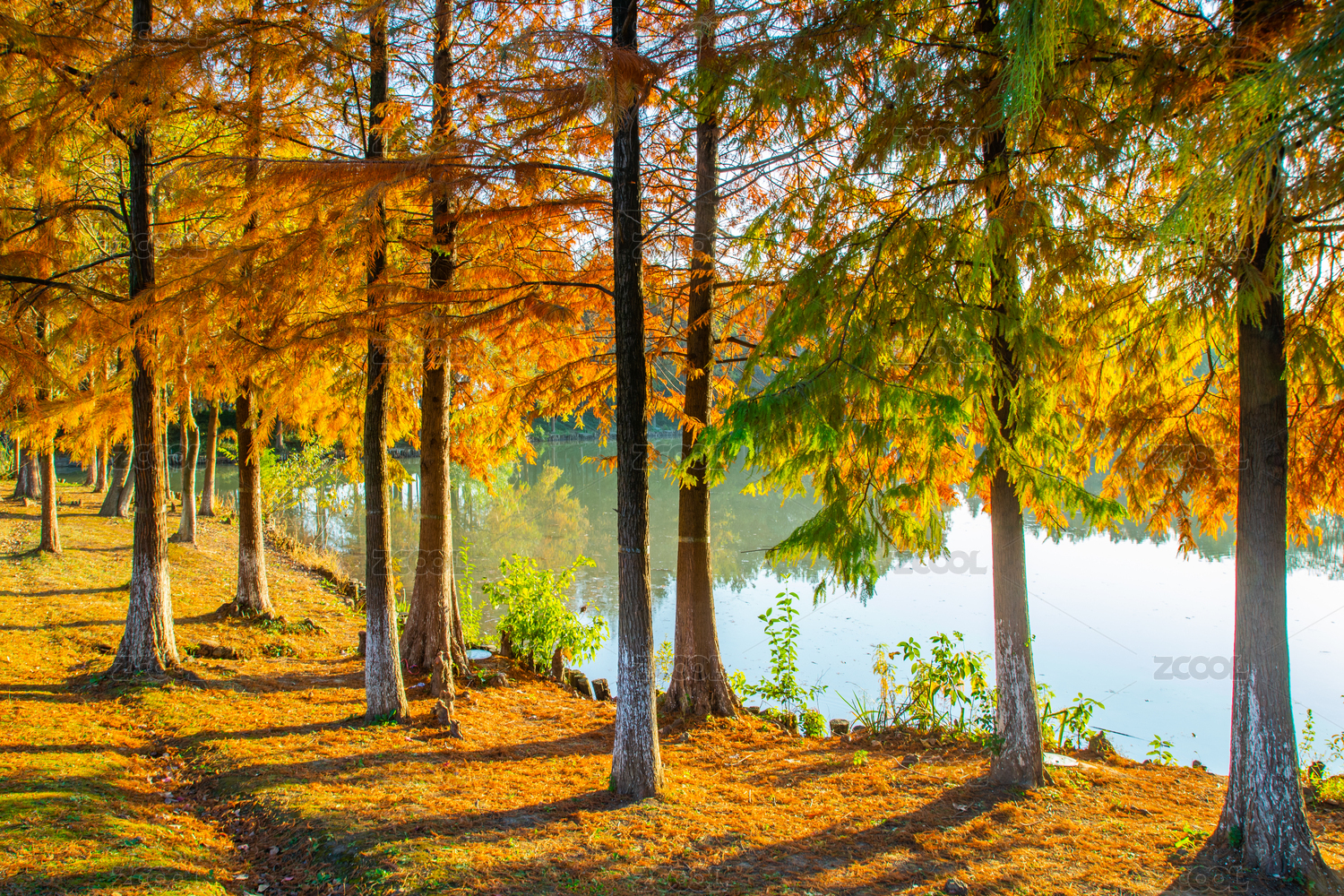 秋日水畔斑斓落羽杉