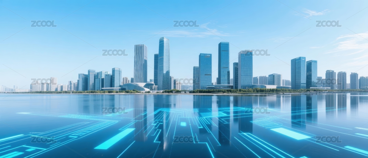 科技城市虚拟概念玻璃建筑水面倒影背景