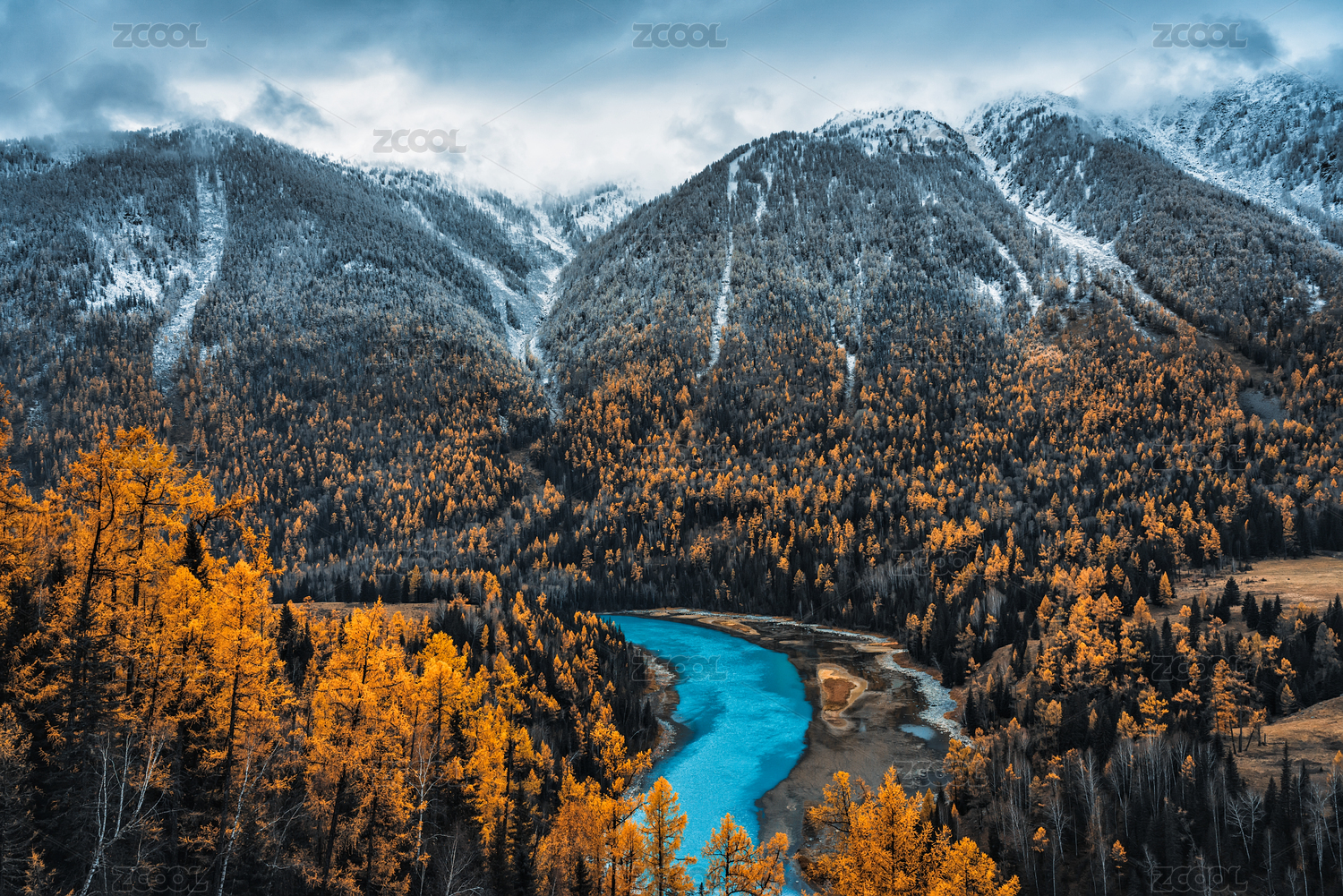 中国新疆喀纳斯卧龙湾雪山秋色风光