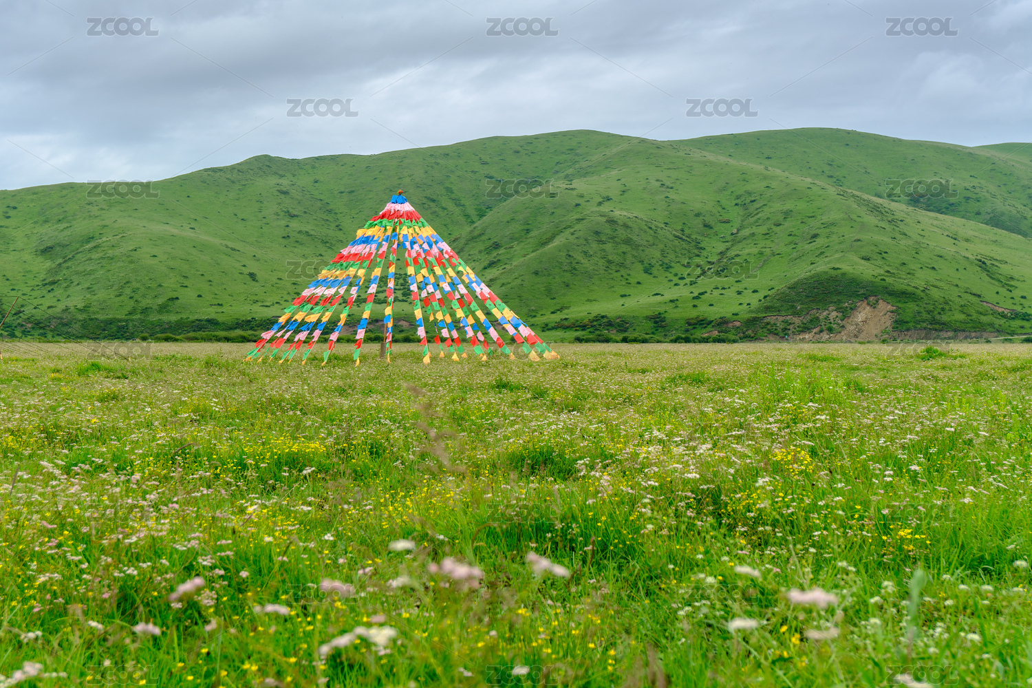 素材,背景,蓝天,白云,人像背景,无人,户外,草原,五彩经幡,山脉