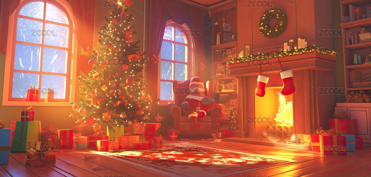 温馨圣诞夜小屋壁炉圣诞树礼物